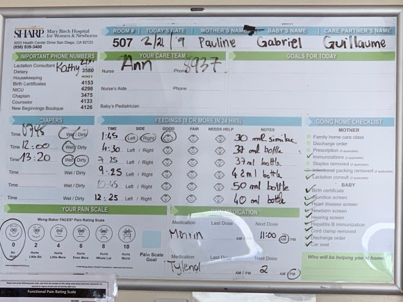 Sur le reste de la journée, Ally (l’infirmière) fait en sorte de nous cocher un bon nombre de case de notre check-list (que nous devons remplir avant de sortir de la maternité) : elle fait même tout son possible pour qu’il ne reste quasiment rien à cocher sur la liste !