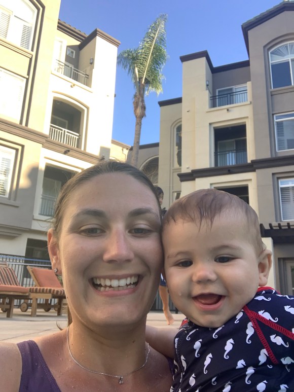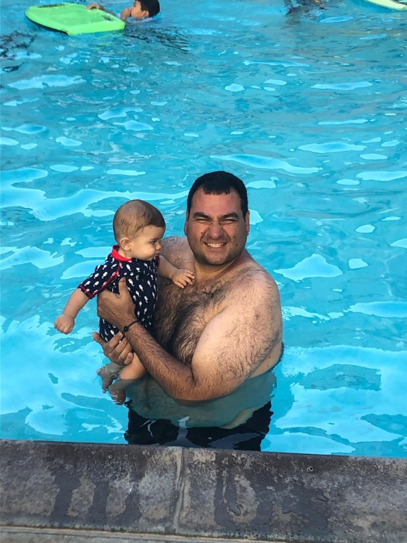 Pendant la visite d’Ugo et d’Anne Cécile, Gabriel a découvert les joies de la piscine!
