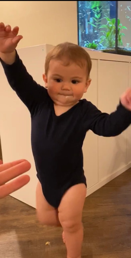 On ne peut pas dire vraiment premiers pas parce qu’il nous en avait déjà fait 2 ou 3 comme ça pour essayer mais dimanche monsieur Gabriel s’est vraiment entraîné à marcher seul plusieurs fois de façon répété!