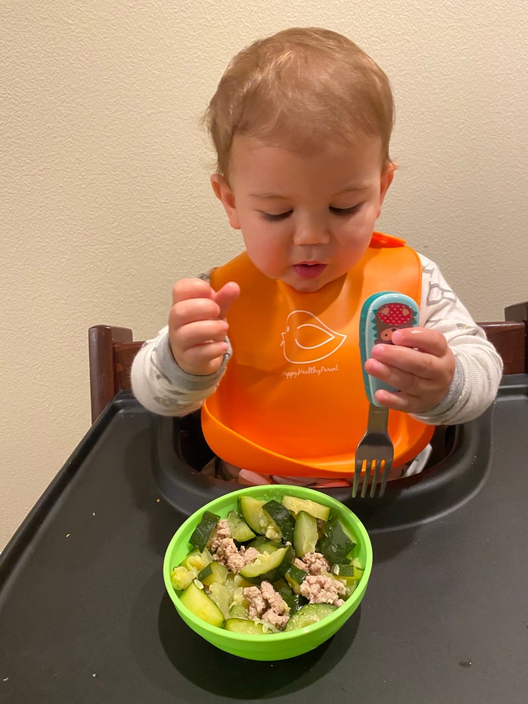 Gabriel mange ses courgettes et sa dinde avec sa petite fourchette (et surtout ses mains!)