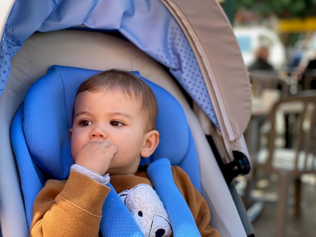 Petite ballade dans la résidence! Gabriel a bien marché! (Et Guillaume s’est rendu compte que oui il allait nous falloir une deuxième poussette!)