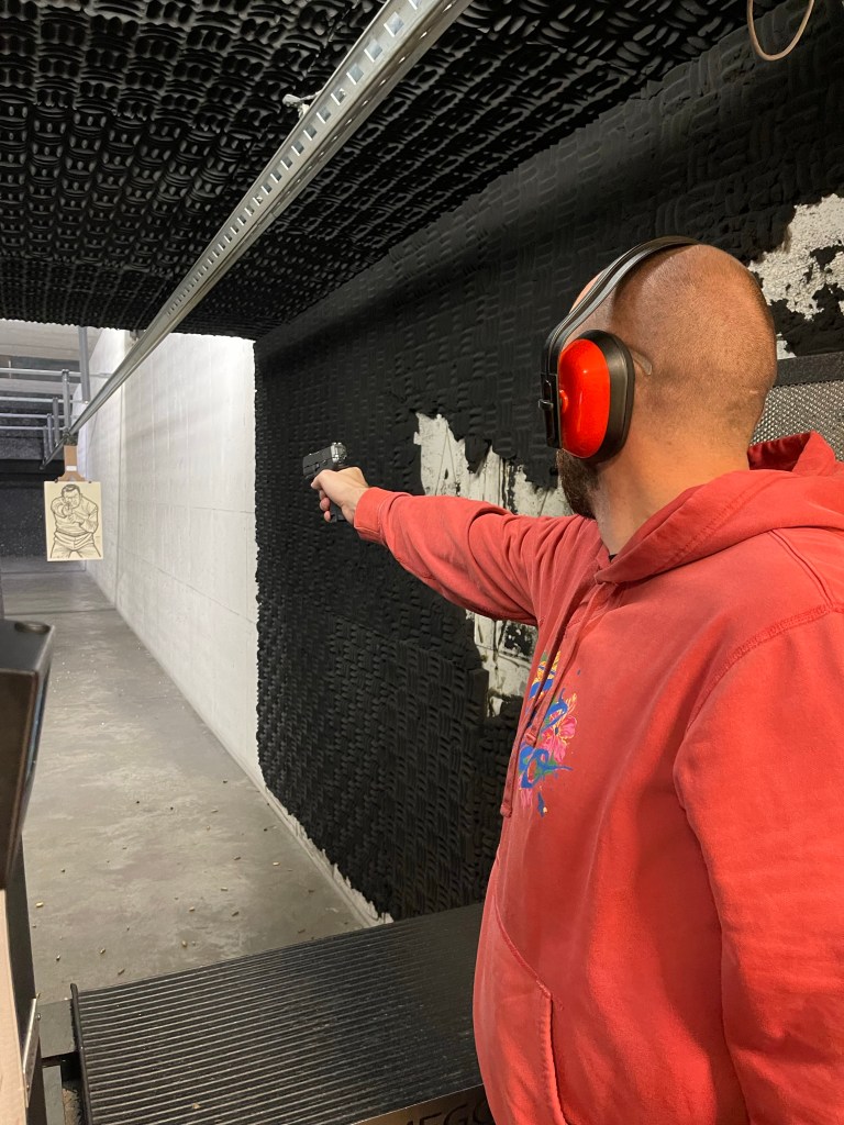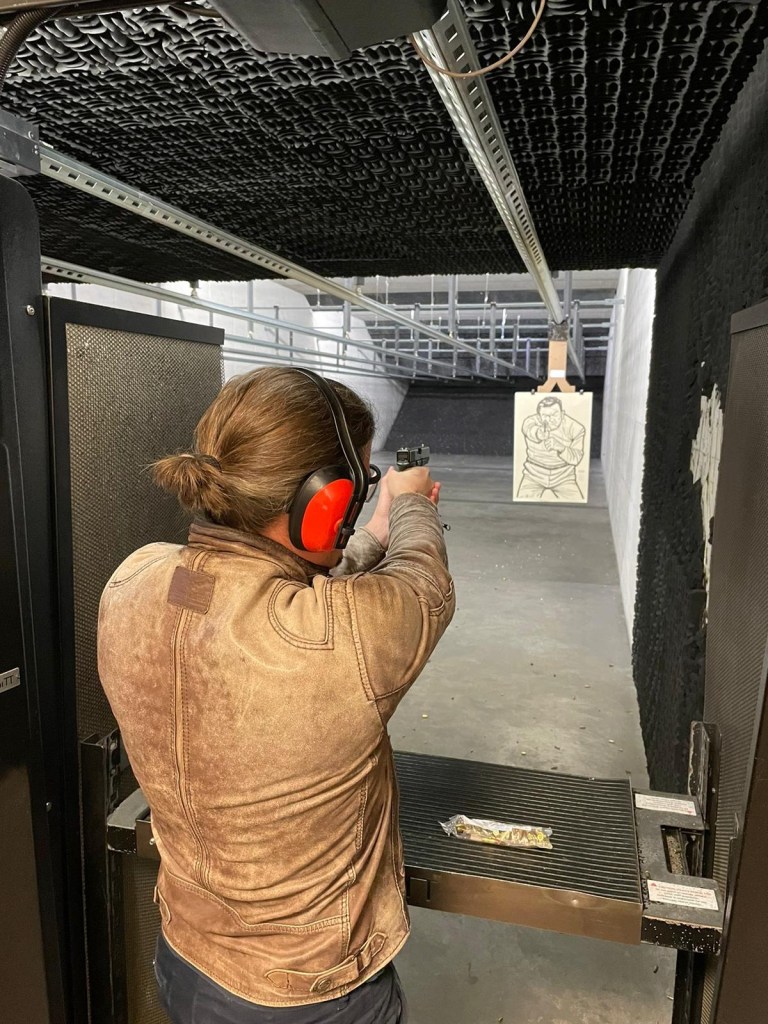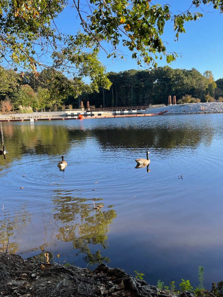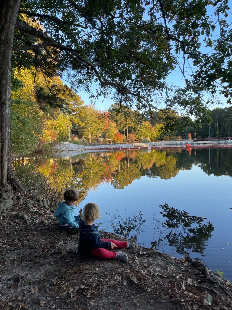 Une fois son travail fini, nous nous dirigeons vers Peach Tree. Un autre petit village très sympa et très atypique autour d’un lac où tout le monde se déplace en voiturette de golf. Nous nous séparons en deux équipes : femmes et enfants se promènent et les hommes, les vrais, vont tirer à l’arme à feu au stand de tir! Les enfants s’amusent comme des fous à jeter des bâtons dans le lac. (les grands garçons aussi…)