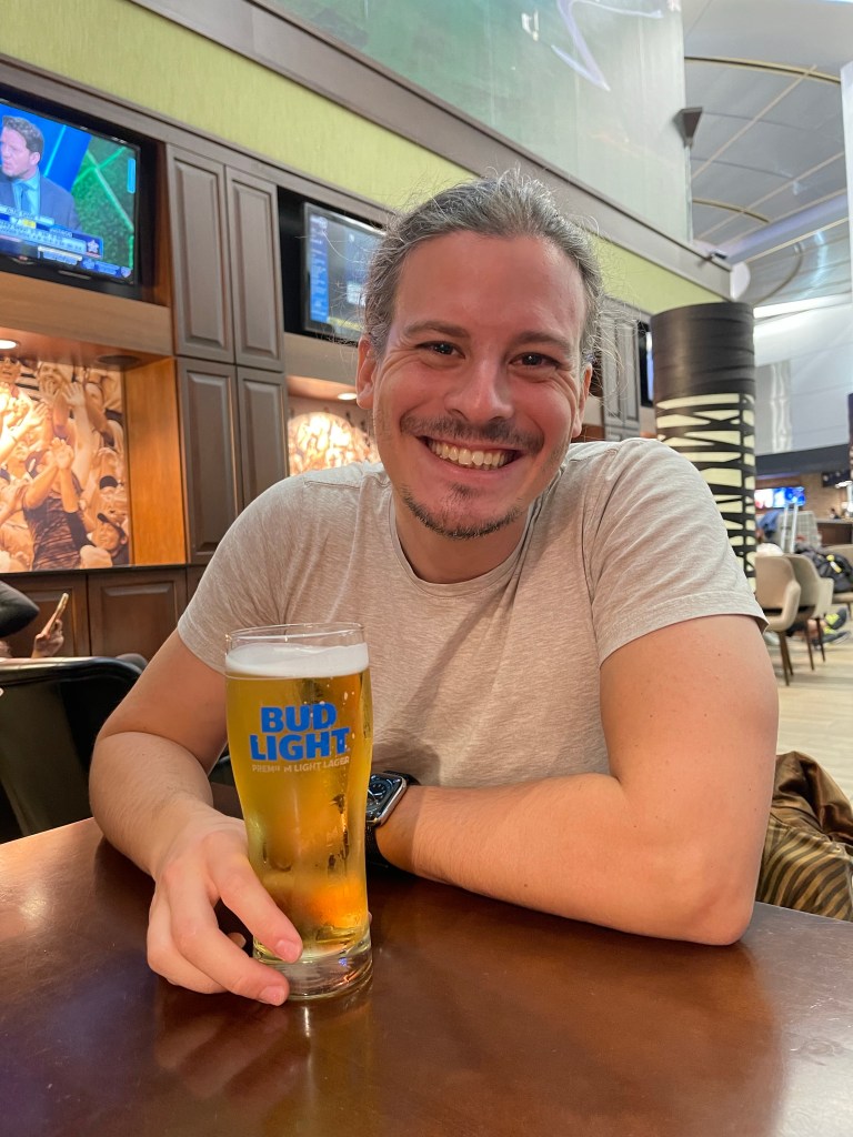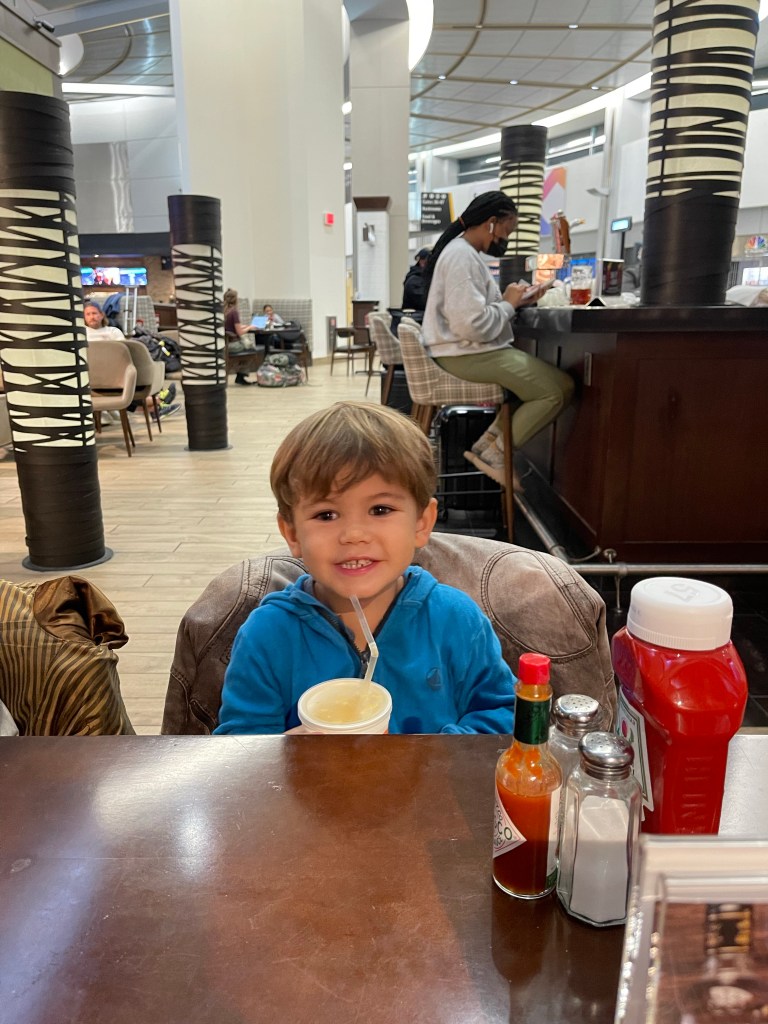 Nous prenons l’avion mardi soir pour un vol de nuit de 5:00. Mais avant d’embarquer nous prenons un dîner à l’aéroport.