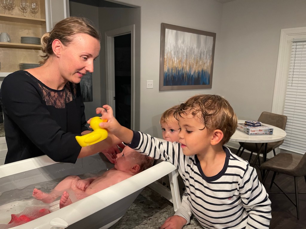 Une fois arrivé à la maison, posés et lavés, les enfants donnent le bain à Marla avec Margot.