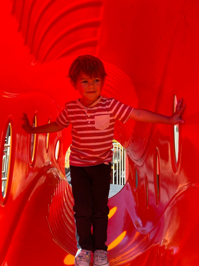 Une fois dans le parc, la chose qui le choque le plus: les amenities pour les chiens : des énormes endroits réservés que pour eux et même un énorme complexe de piscine au milieu du parc juste pour eux… nous marchons tranquillement et profitons du parc, de la chaleur et des rigolades entre amis! Puis nous trouvons une aire de jeux pour enfants où nous restons un bon moment! Les enfants sont aux anges!