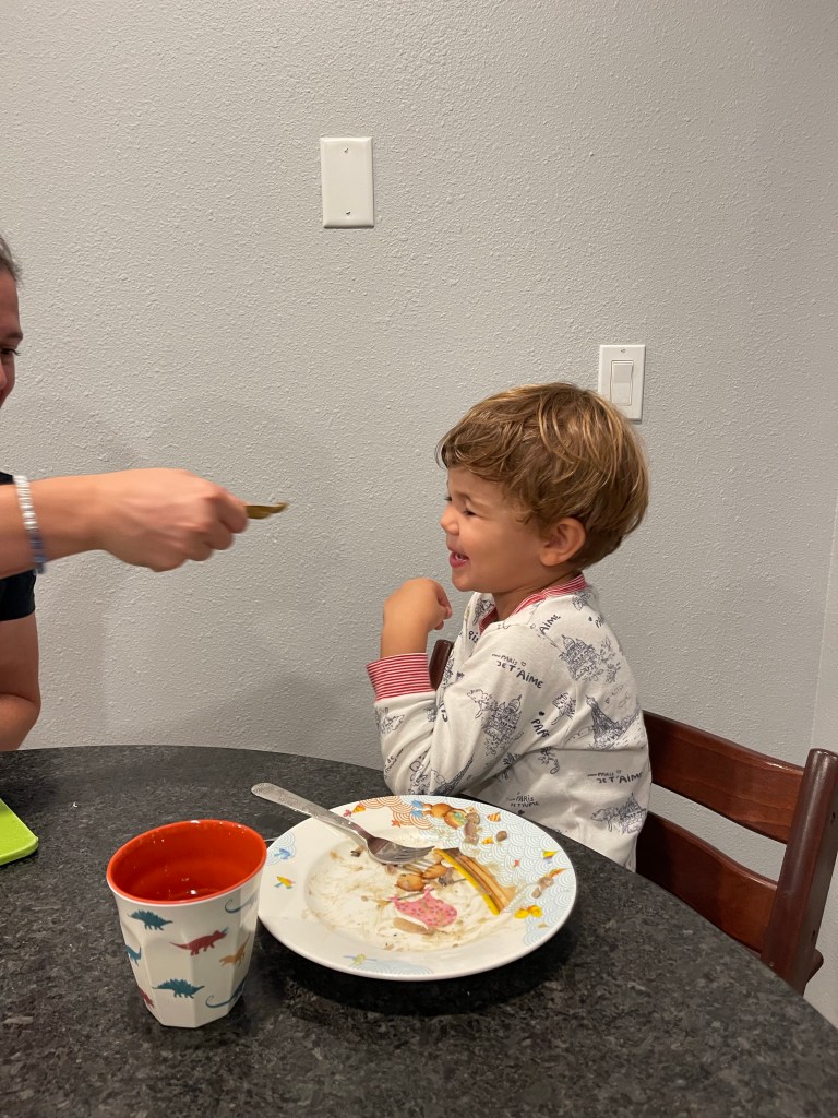 Eleonore se regale, Gabriel est tres inquiet que son papa coupe le cœur de l’artichaut car il va avoir mal!