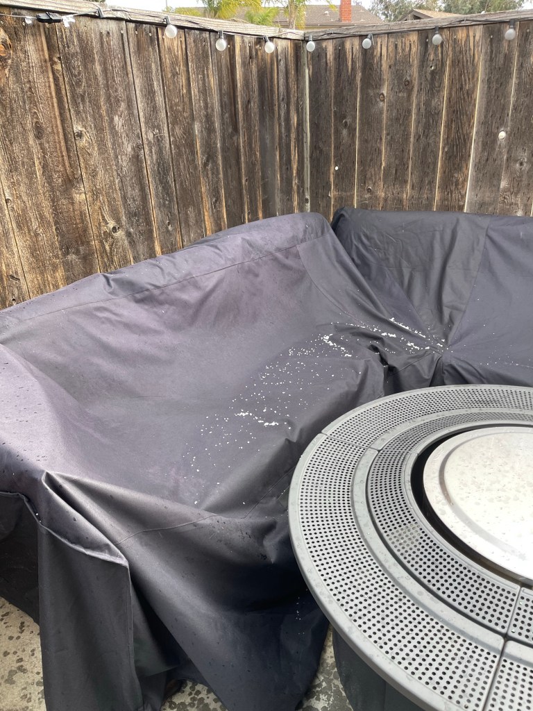 Après des records de précipitation (en tout genre car on a eu deux fois de la grêle depuis le début de la semaine), mon canapé est gelé ce matin… il y a du givre dessus!!!! 😰😰😰