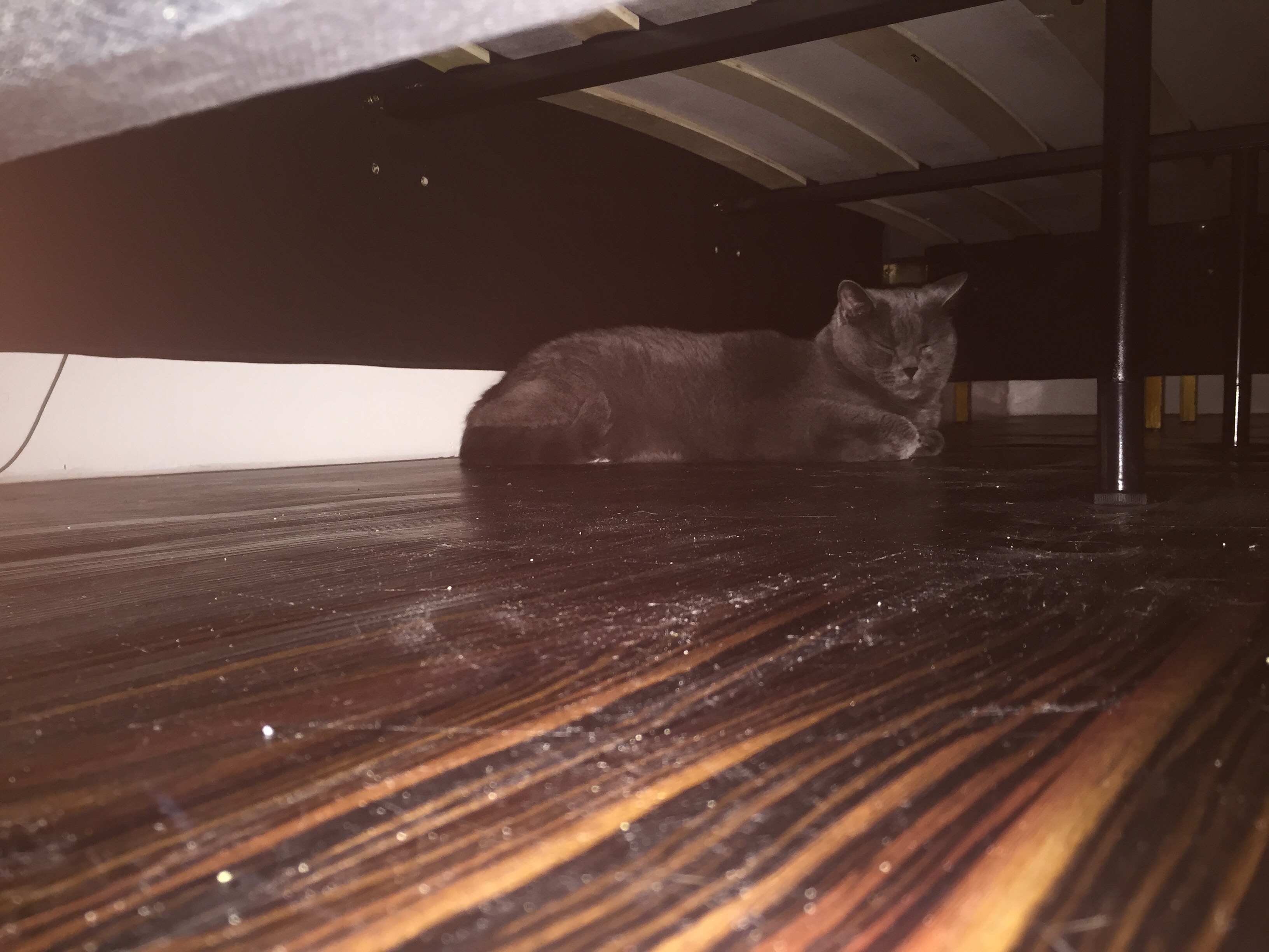 Mais c’était sans compter sur Berlioz qui refuse de sortir de sous le lit! 30min d’essai plus tard, avec le lit déplacé de part et d’autre de la chambre, nous décidons de charger la voiture et que je remonte seule pour essayer de la rassurer et de la faire sortir… 20 min plus tard toujours rien à mon grand désespoir. Guillaume me suggère la manière forte, à savoir le balais. Je retourne donc chercher Marguerite, nous empruntons un balais à la réception et nous partons à la chasse au chat!