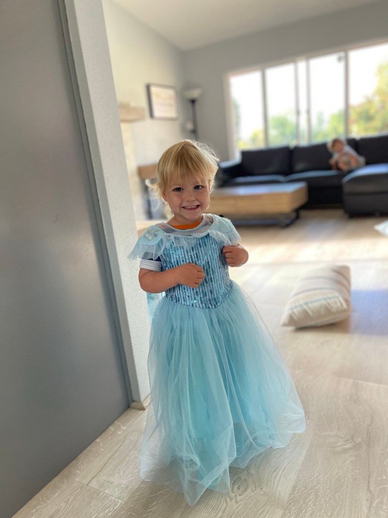 Juliette nous a donné plusieurs vêtements, dont une robe d’Elsa!