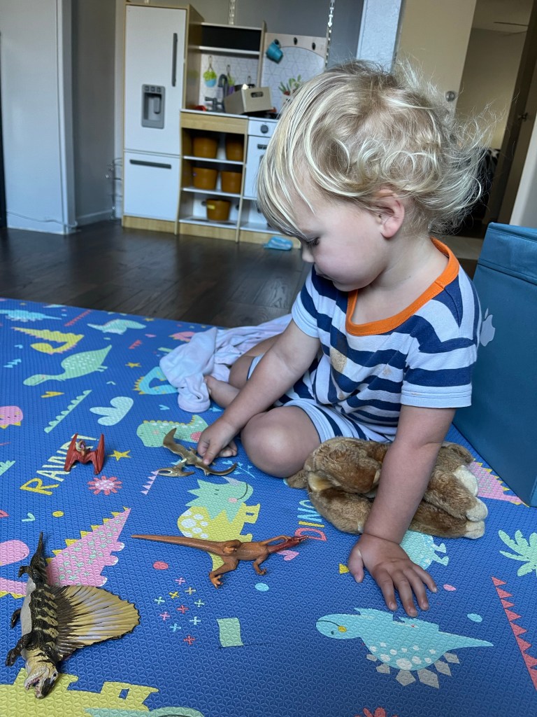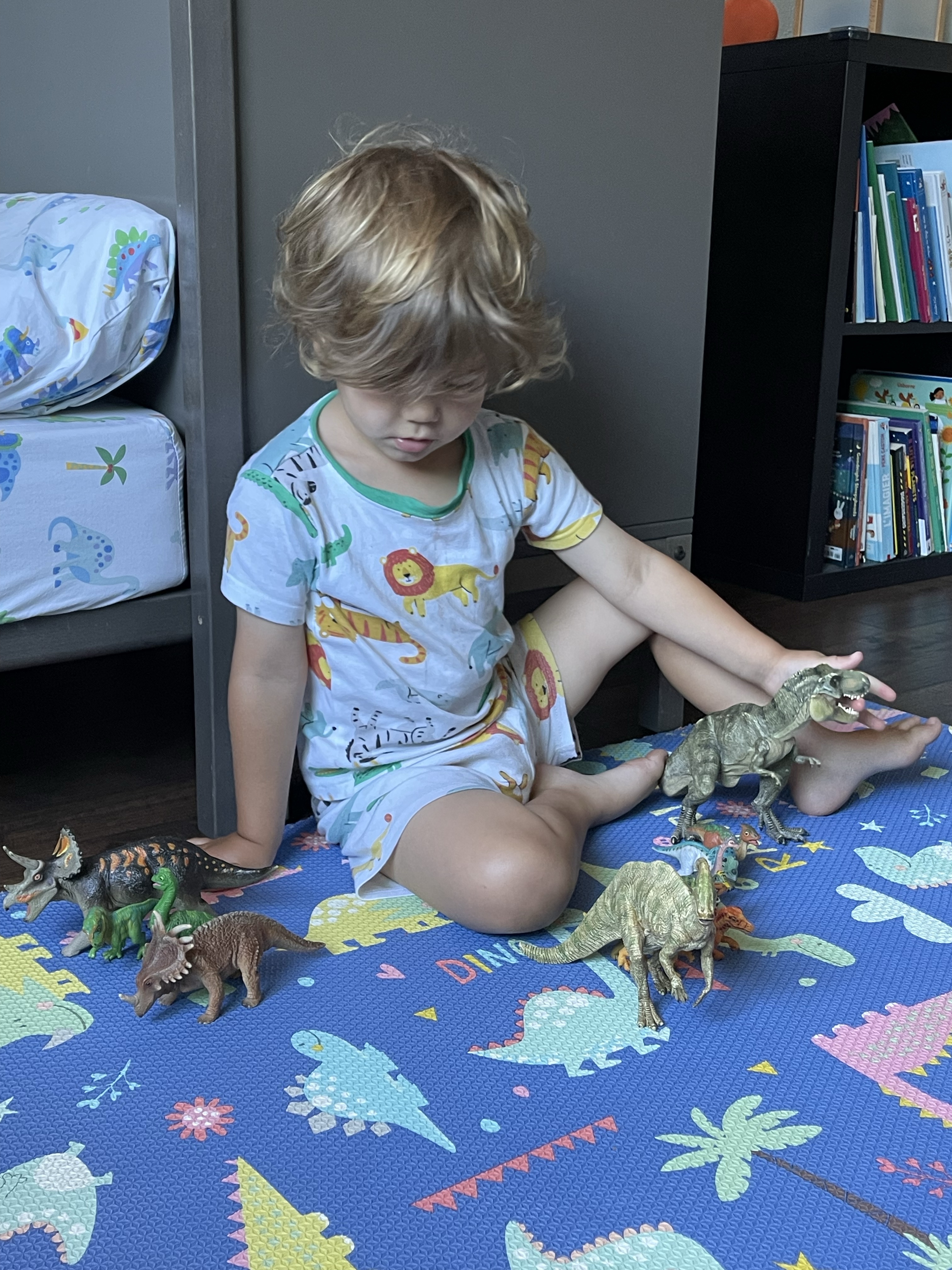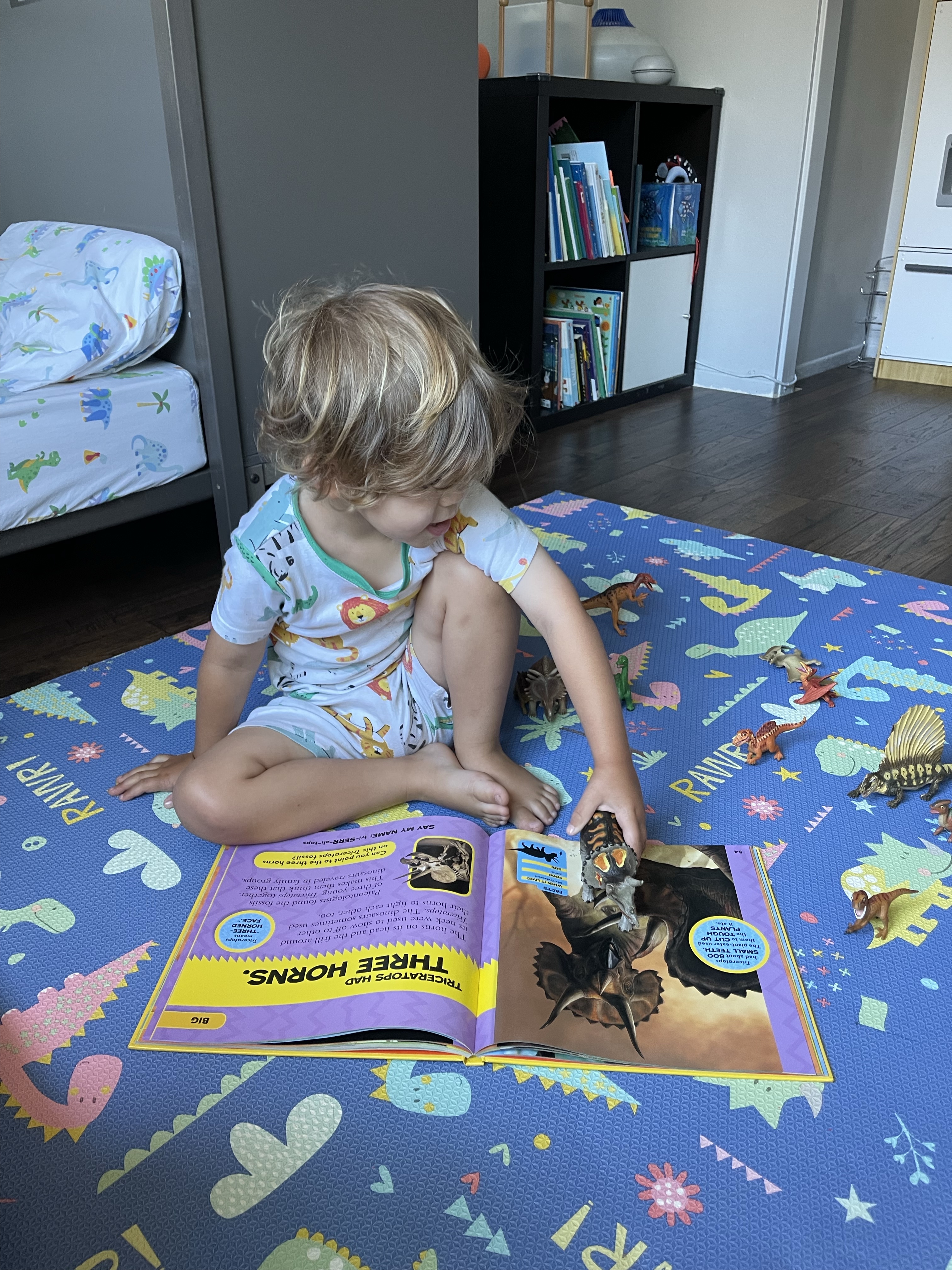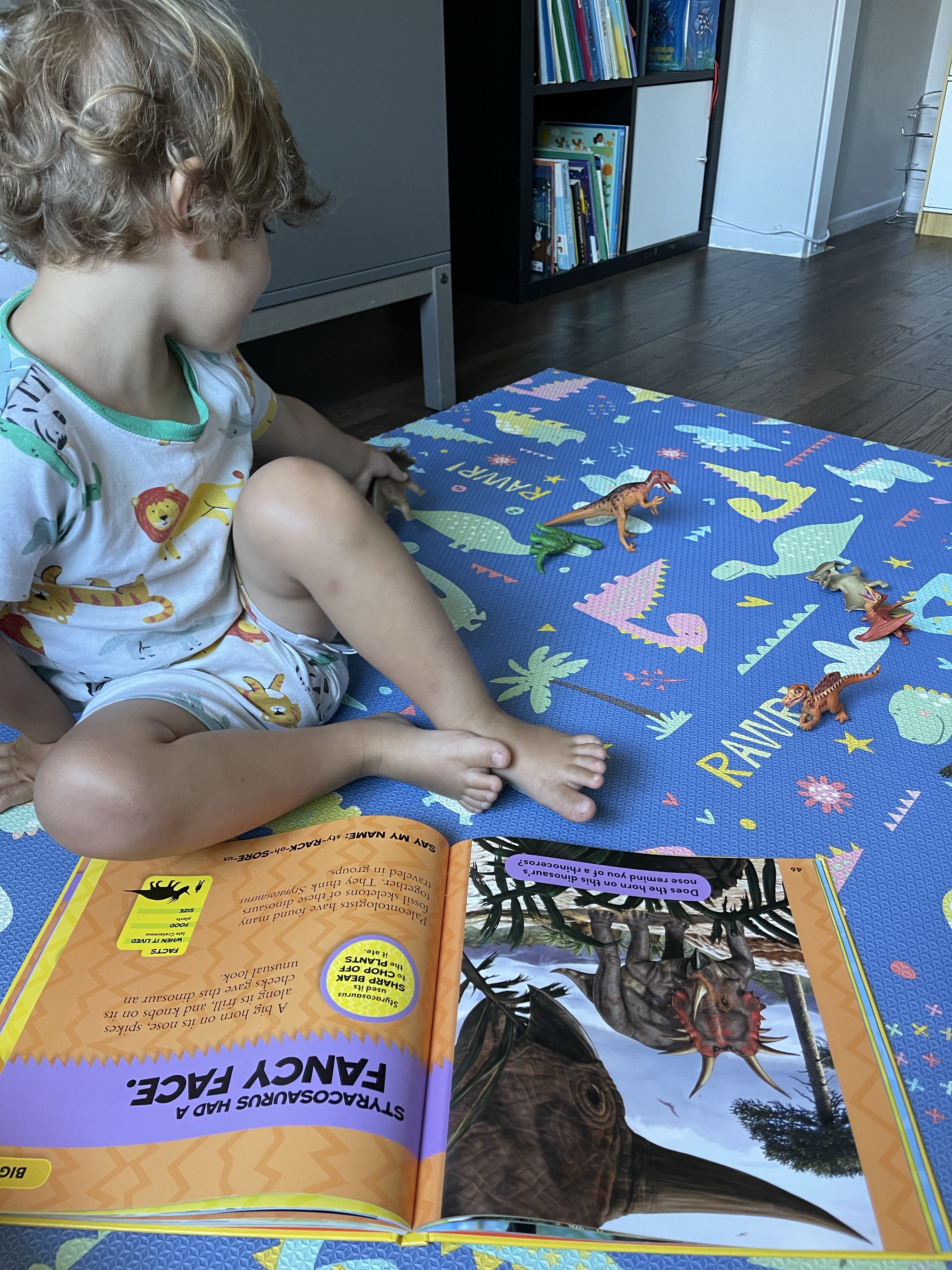 Le but était de retrouver les dinosaures dans le livre… ensuite Gabriel a recomposé des familles comme il voulait! Je ne suis pas sure que les dinosaures étaient d’accord cependant!
