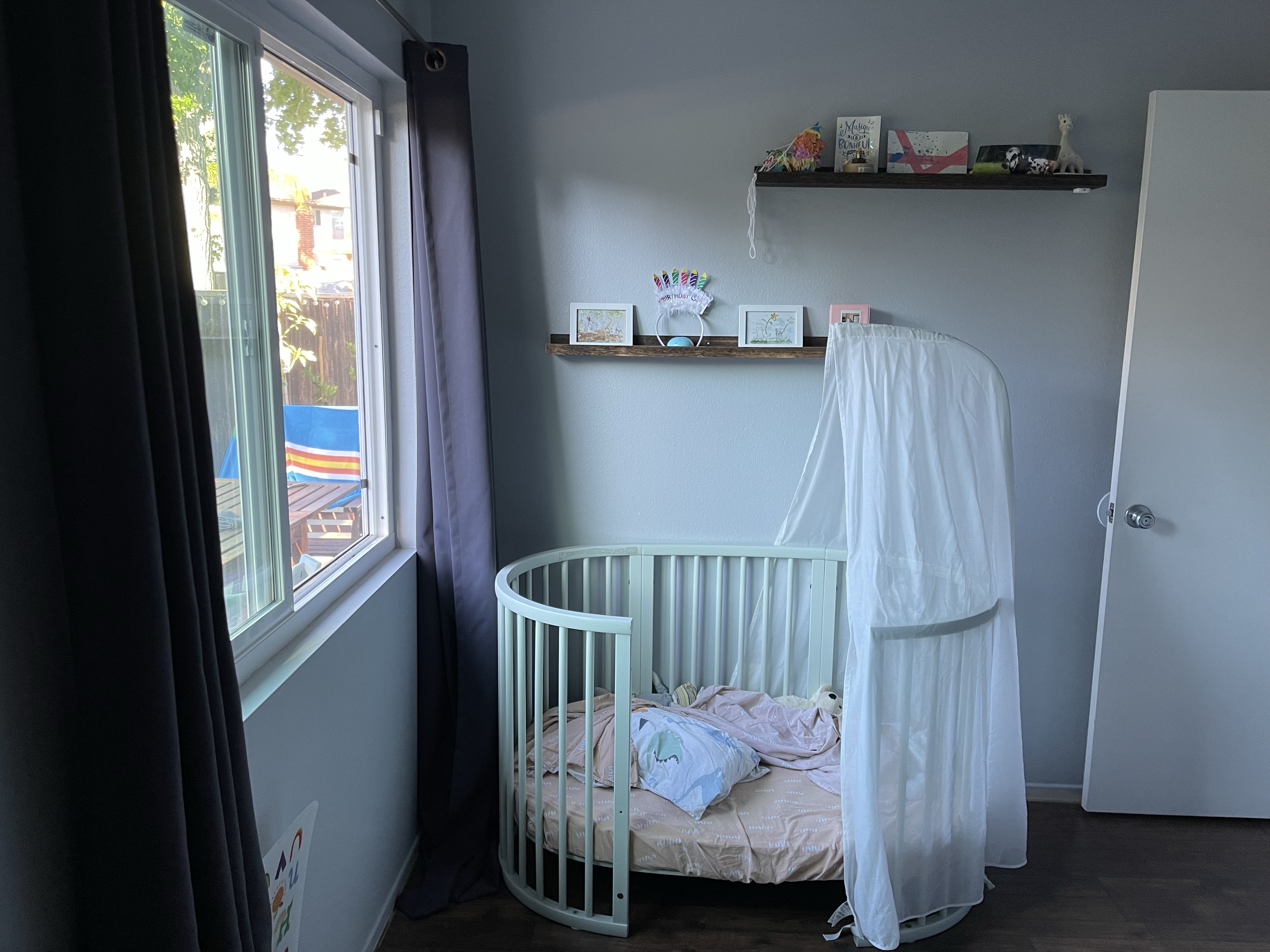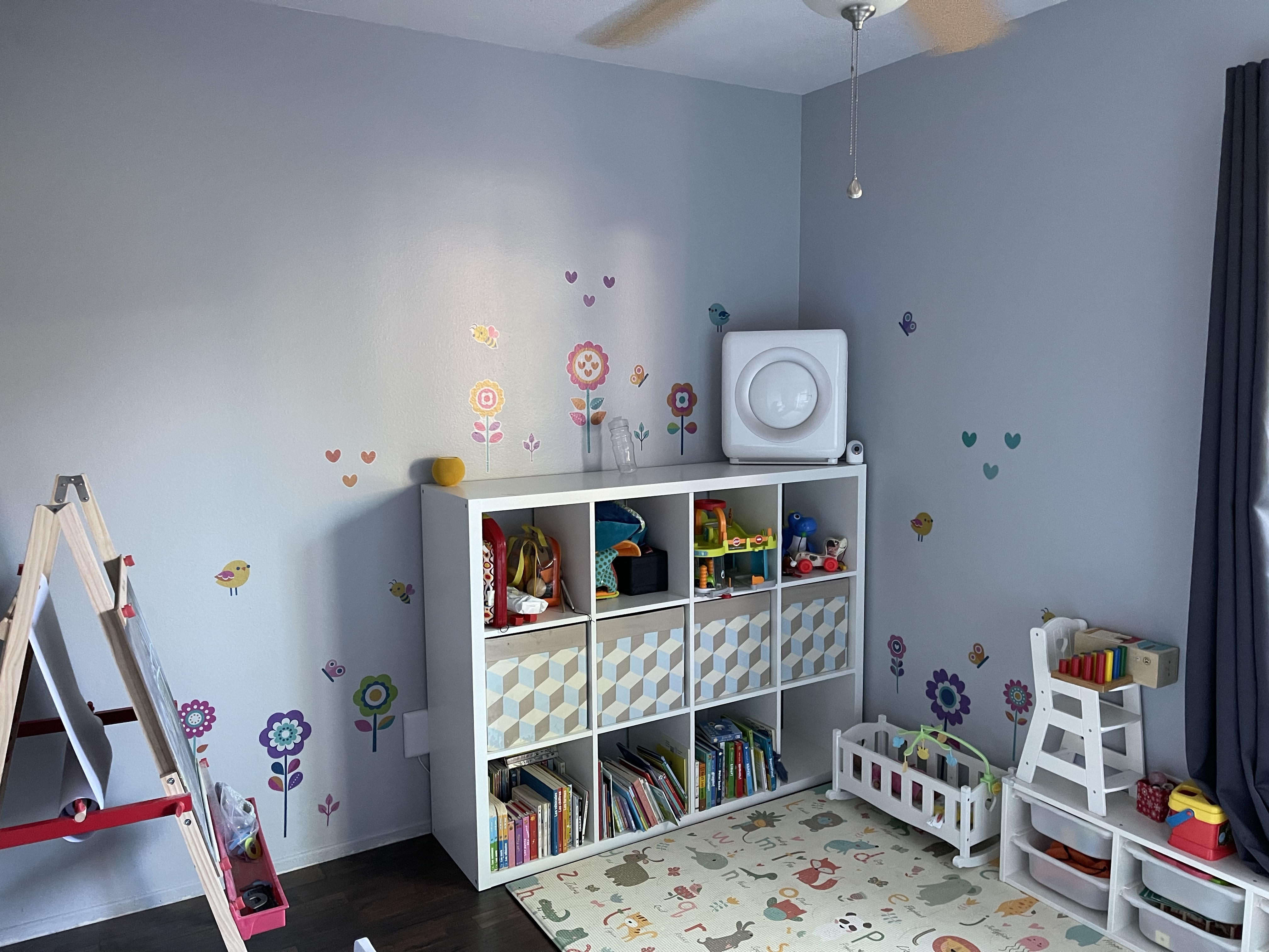 Voilà la chambre de la princesse! Elle a choisi un sticker avec des « flowers » comme elle dit, ainsi que des papillons et des abeilles!