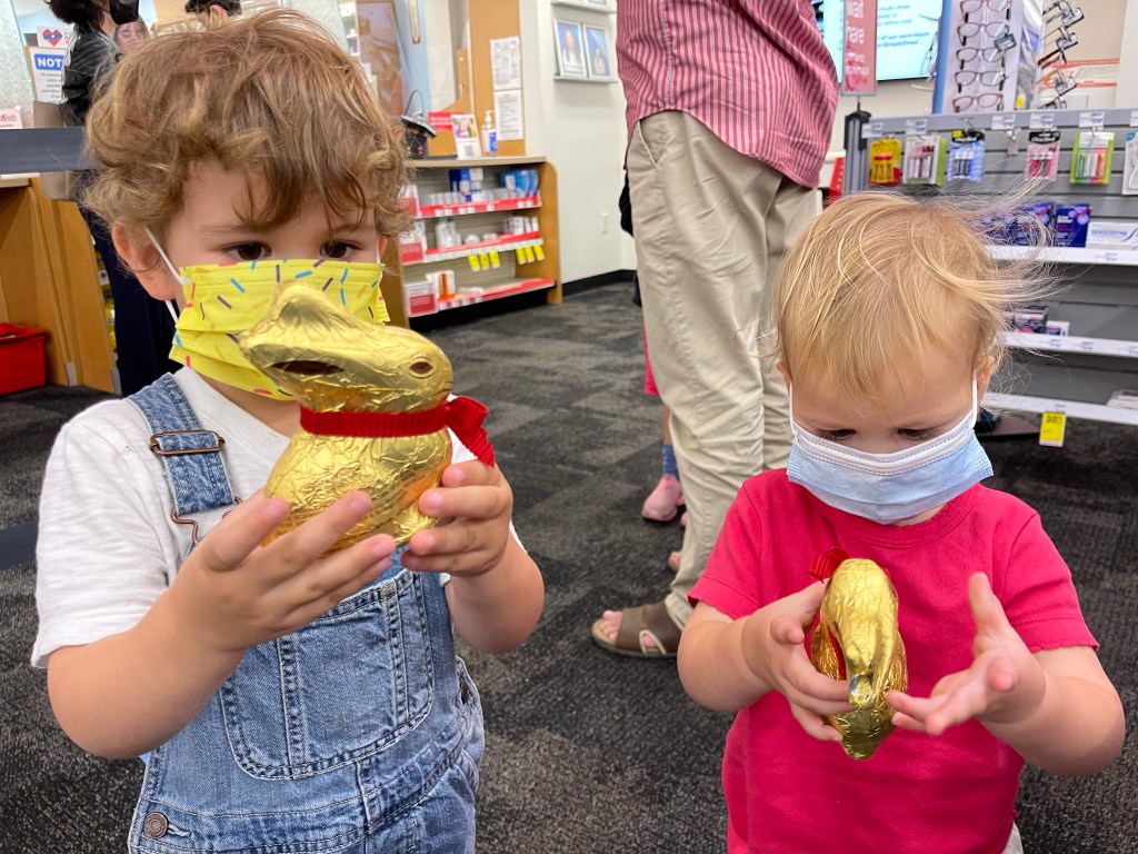Nous y avons également trouvé des lapins en chocolat pour Pâques! (Et nous avons aussi vomi sur la moquette, après avoir vomi dans le siège auto ce matin…)! Ma journée a été très remplie! 😂😂😂
