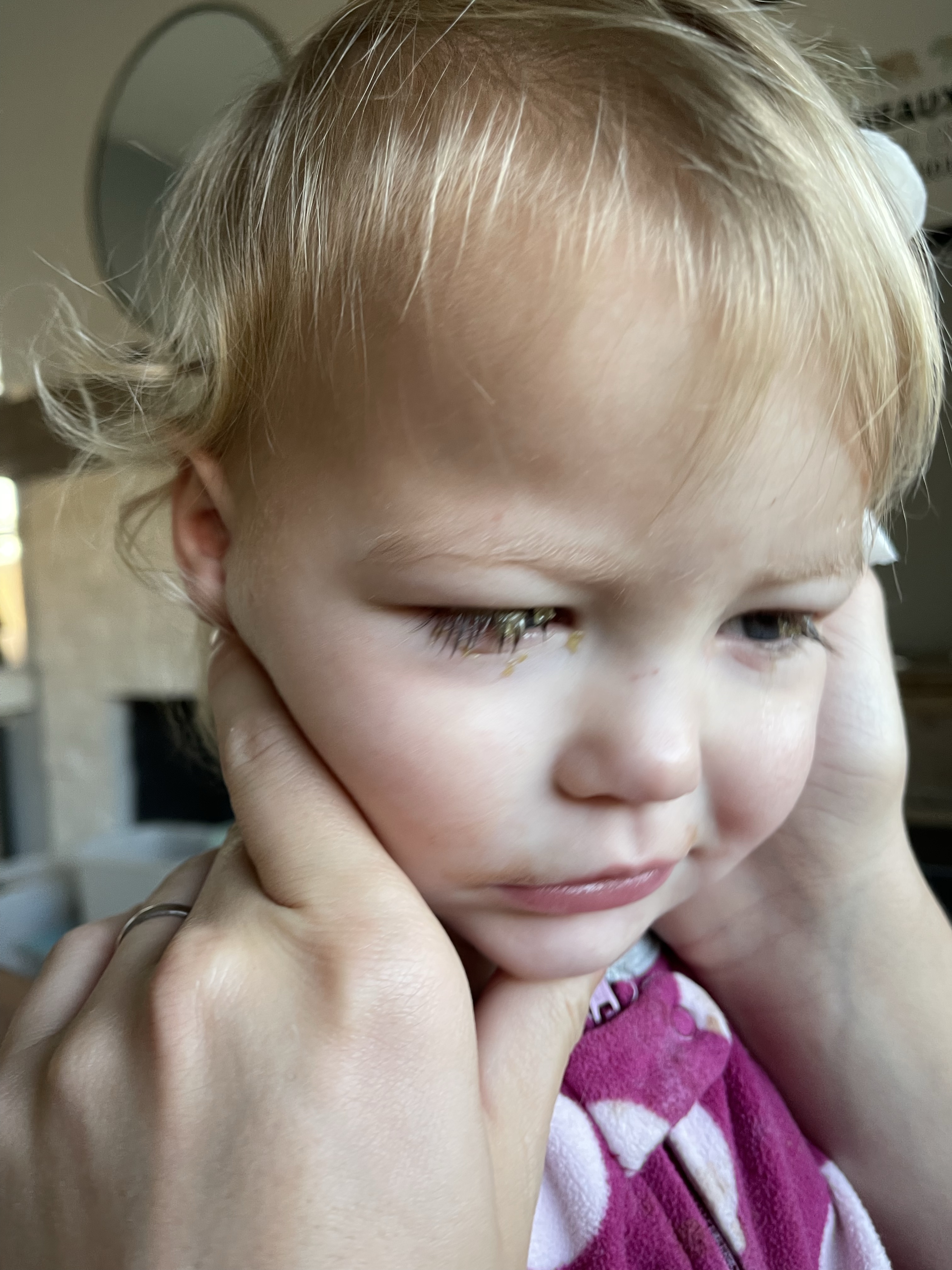 Maintenant que Gabriel va mieux, c’est à Eleonore d’être malade! Depuis dimanche la miss a les yeux gonflés et l’extérieur rouge avec plein de caca vert partout! Berk!!! et elle est extrêmement fatiguée!