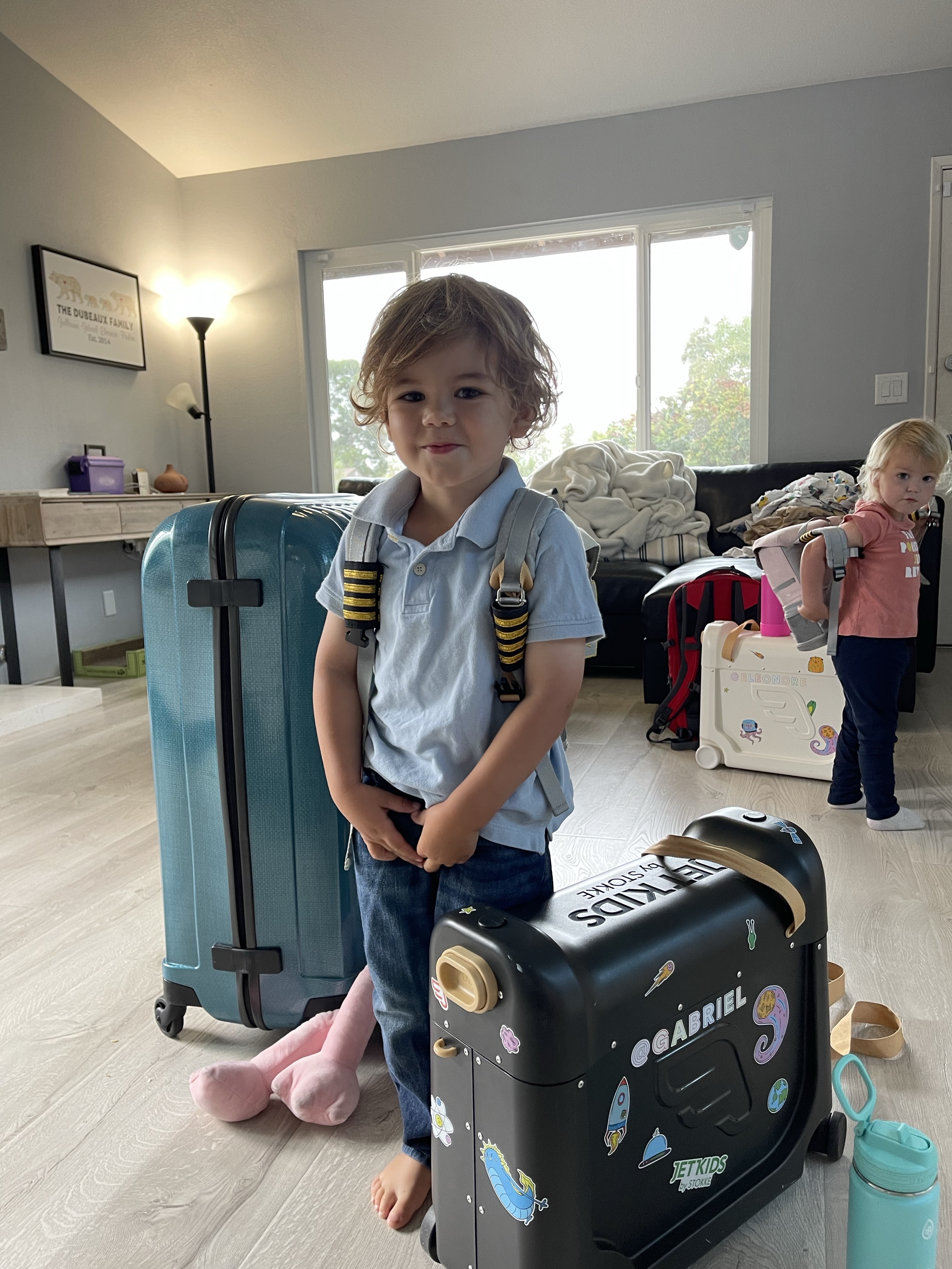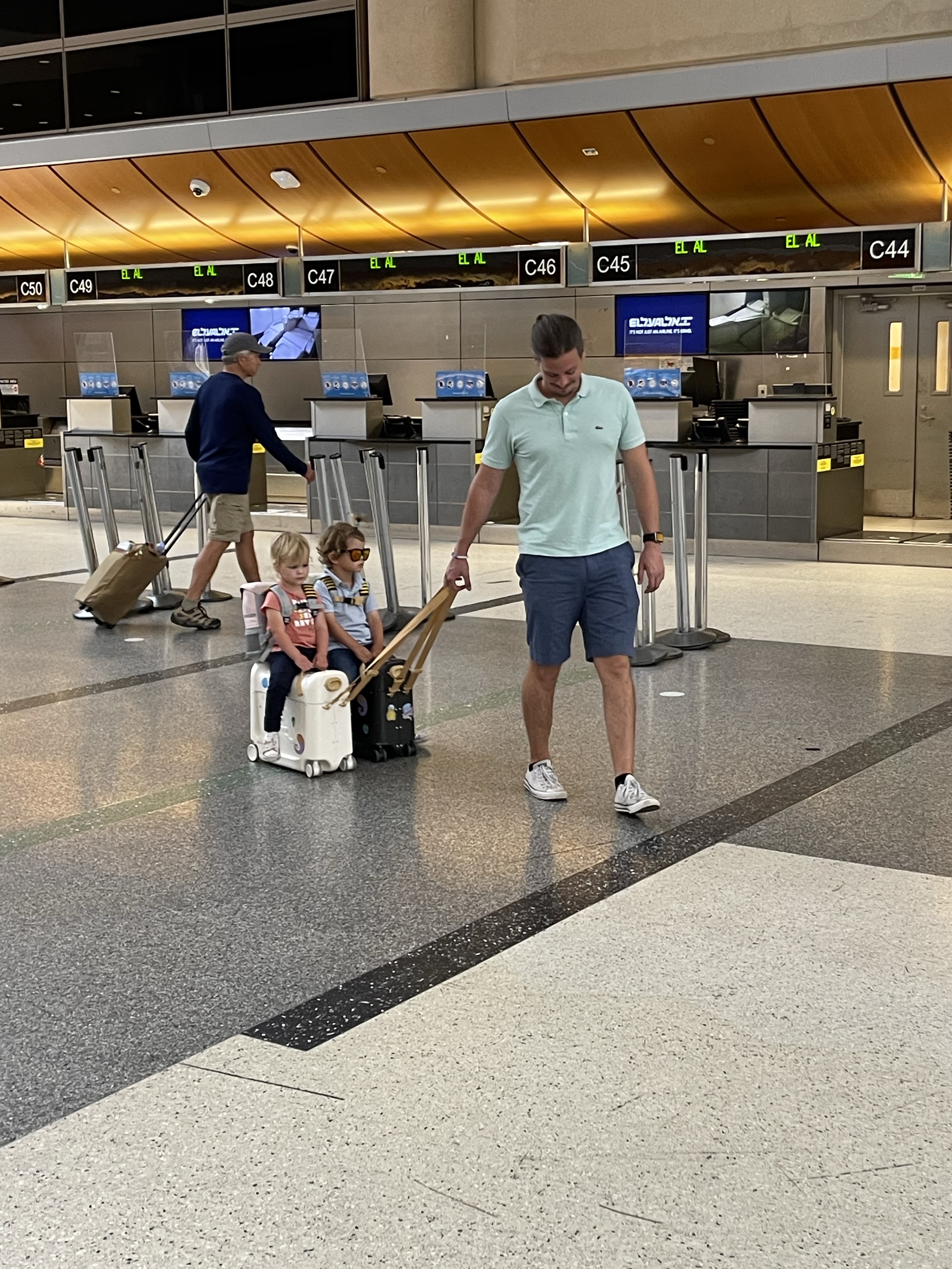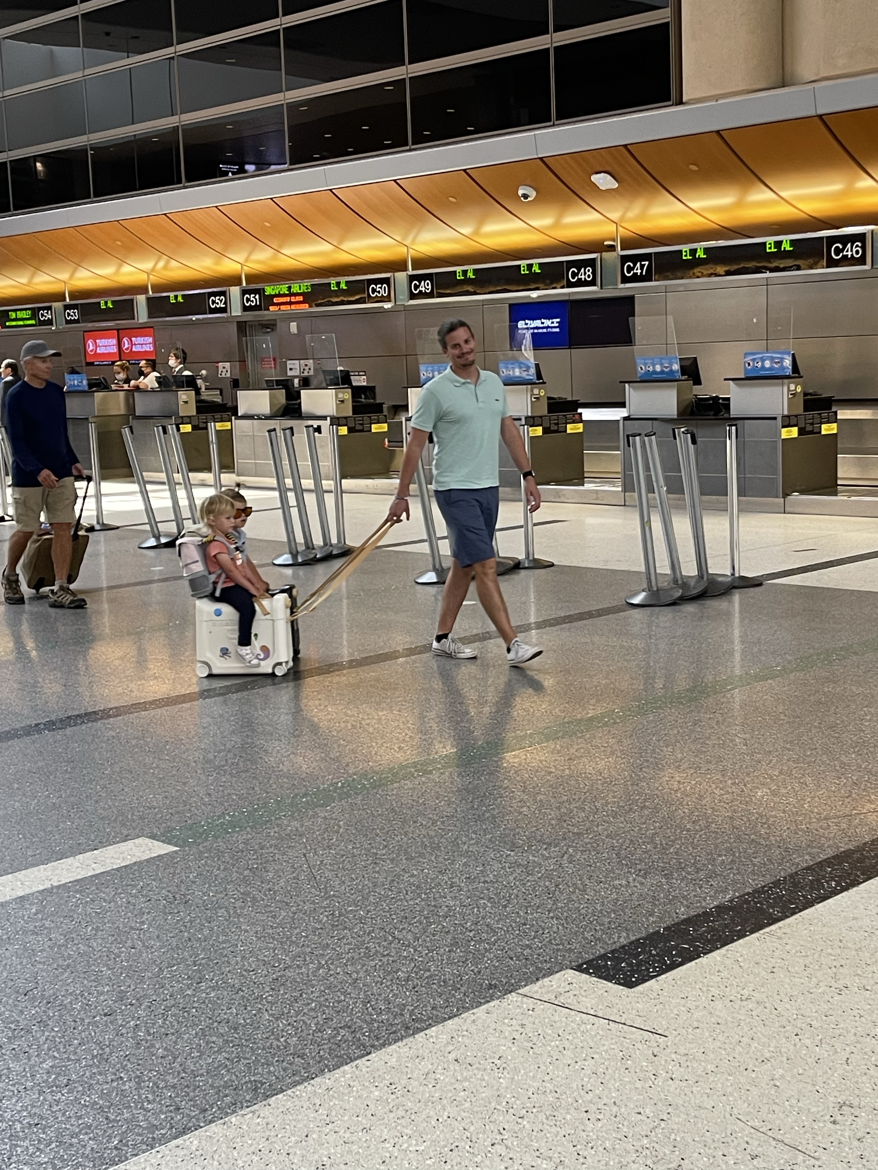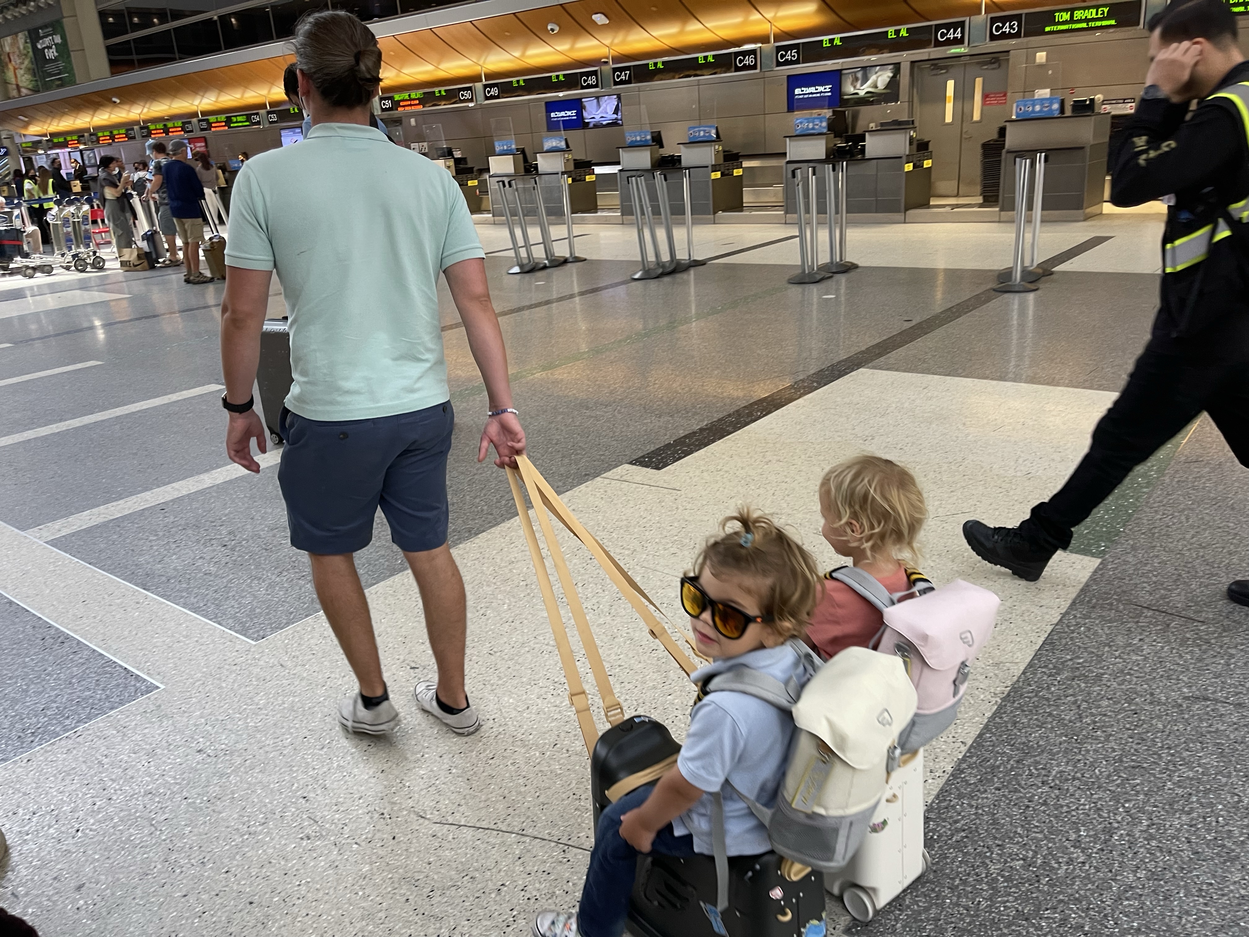Le temps d’enregistrer les bagages, Guillaume s’entraîne à promener les enfants en valise dans l’aéroport… visiblement il se fait plein d’amis!