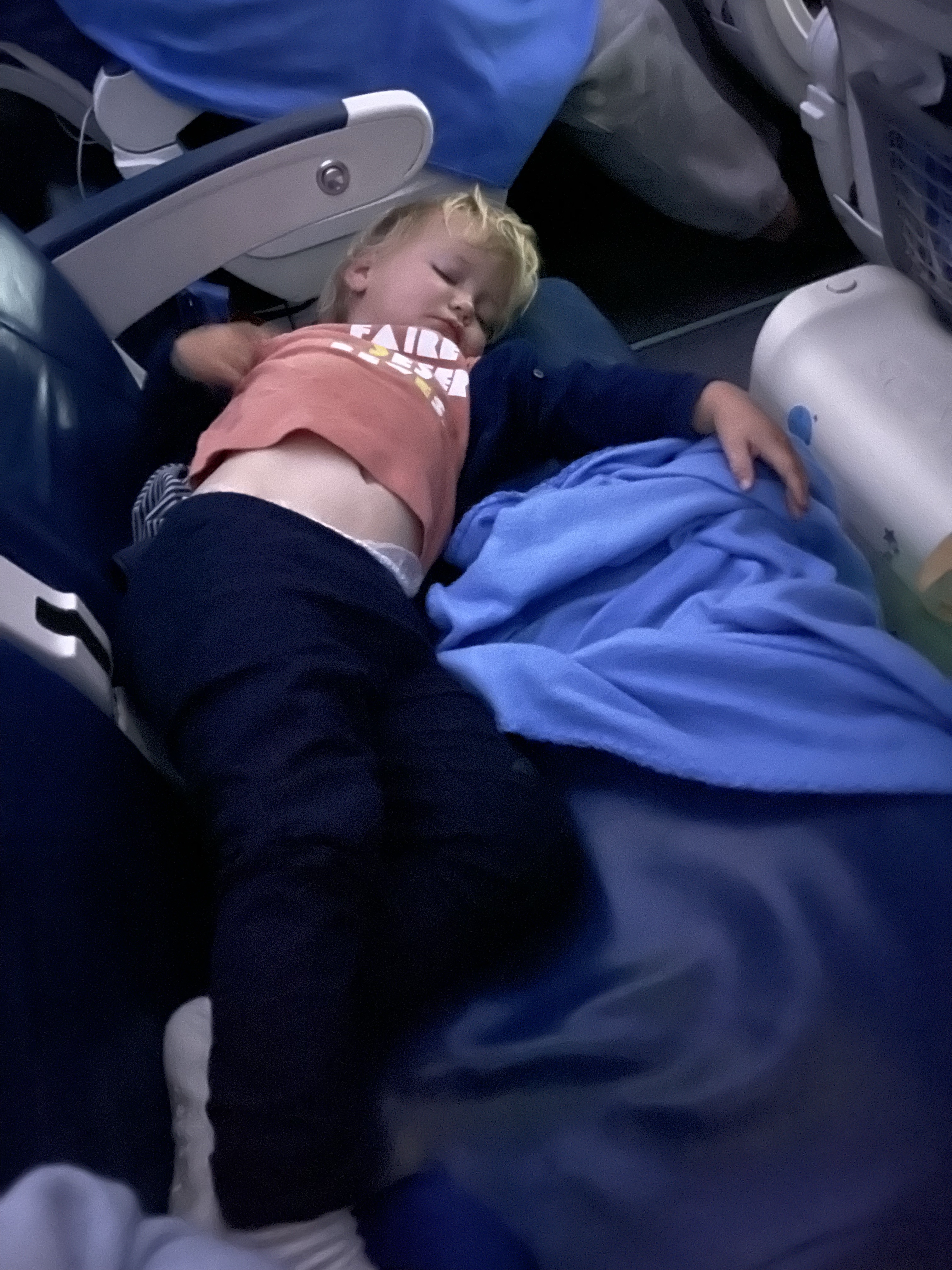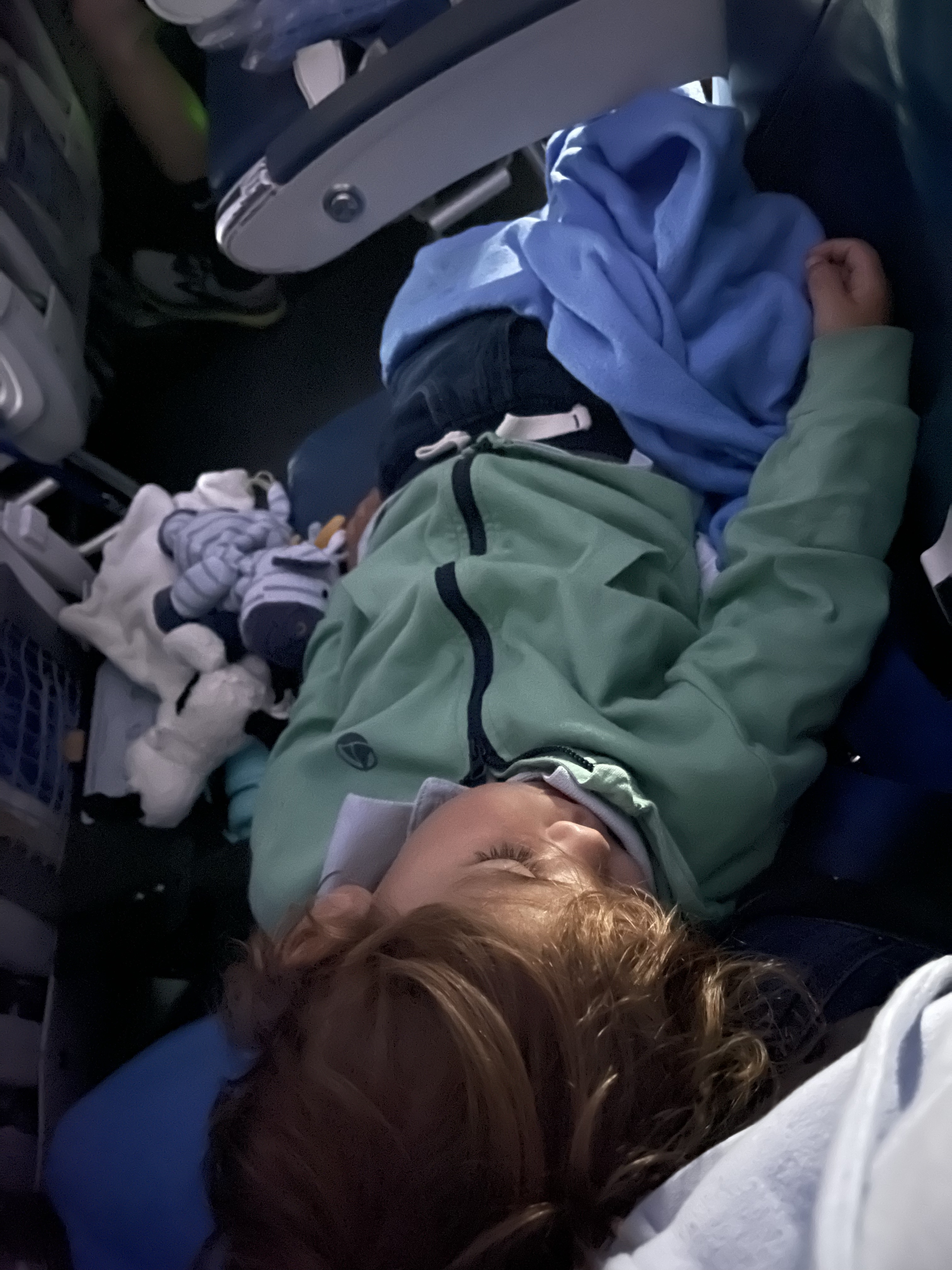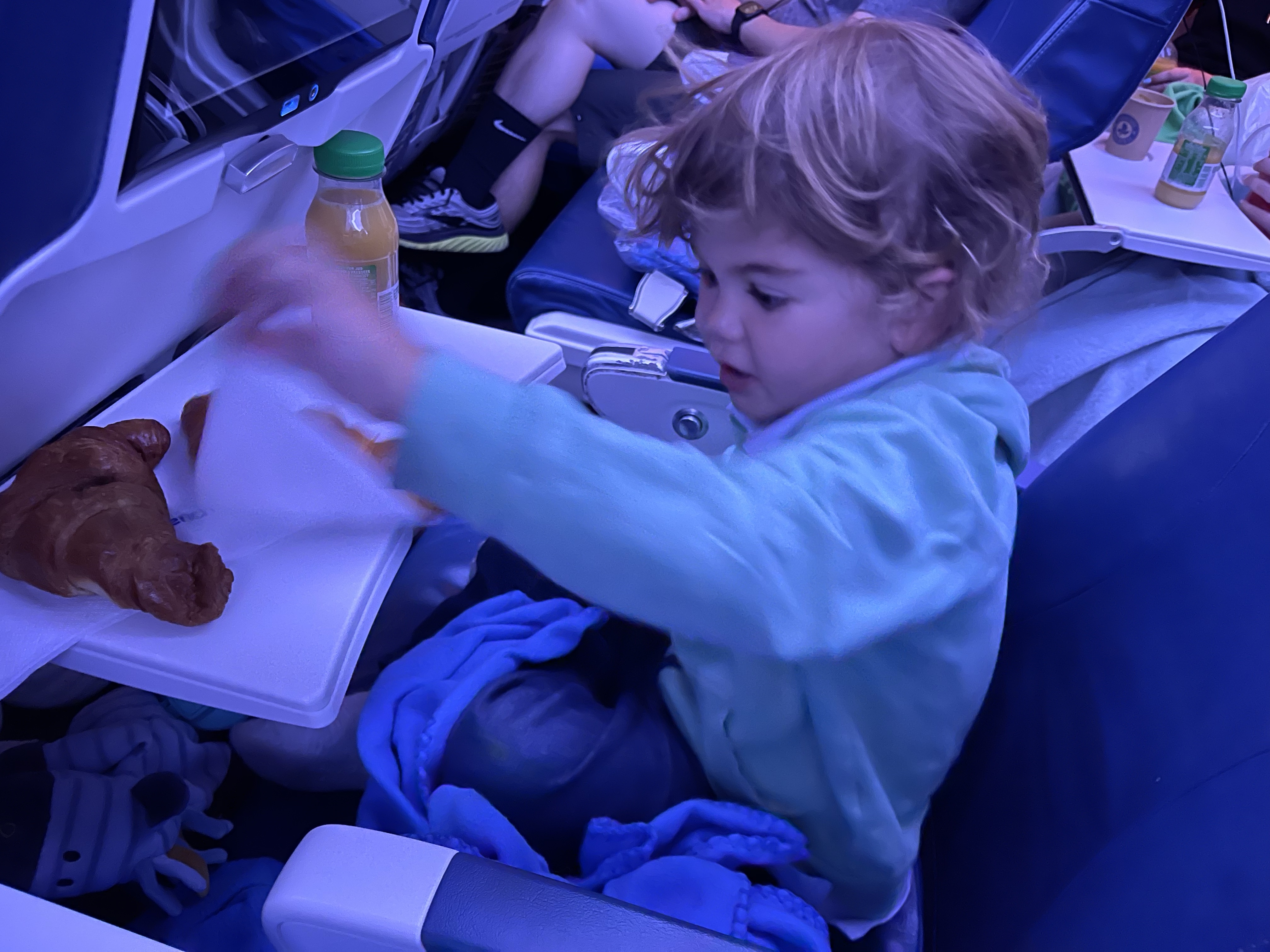 A bord de l’avion nous avons une bonne surprise: il n’y a personne à côté de nous! Nous avons donc un rang de 4 pour nous 3! Les enfants s’installent donc dans leurs sièges!