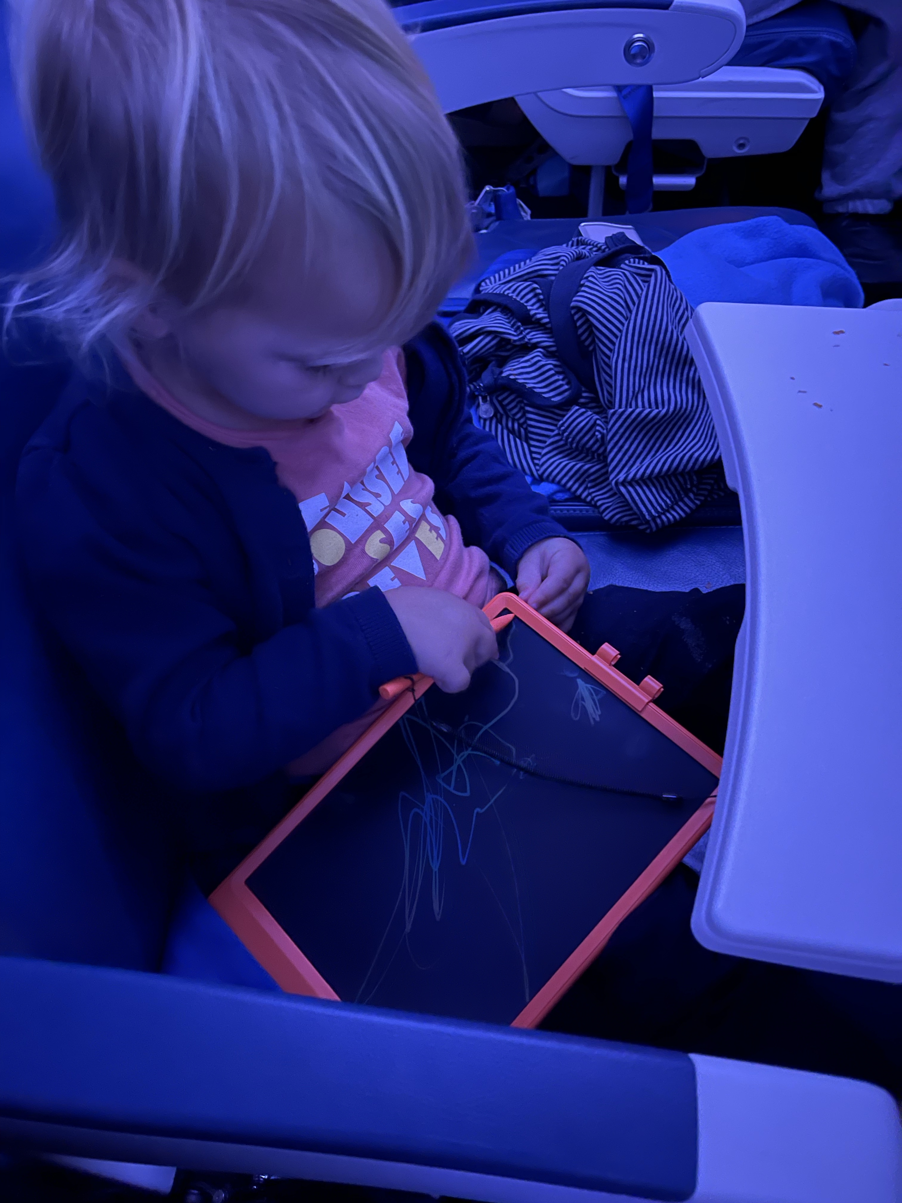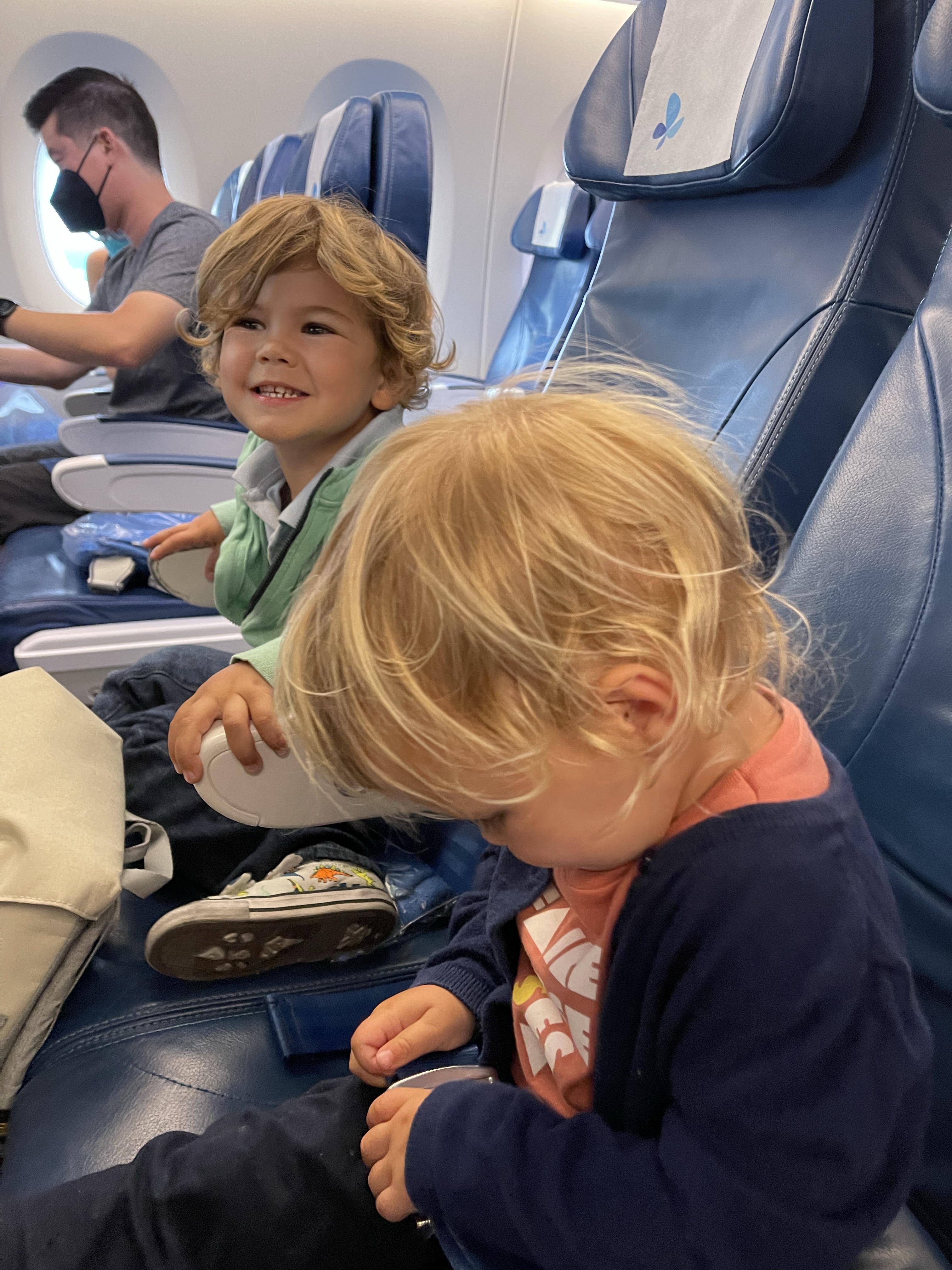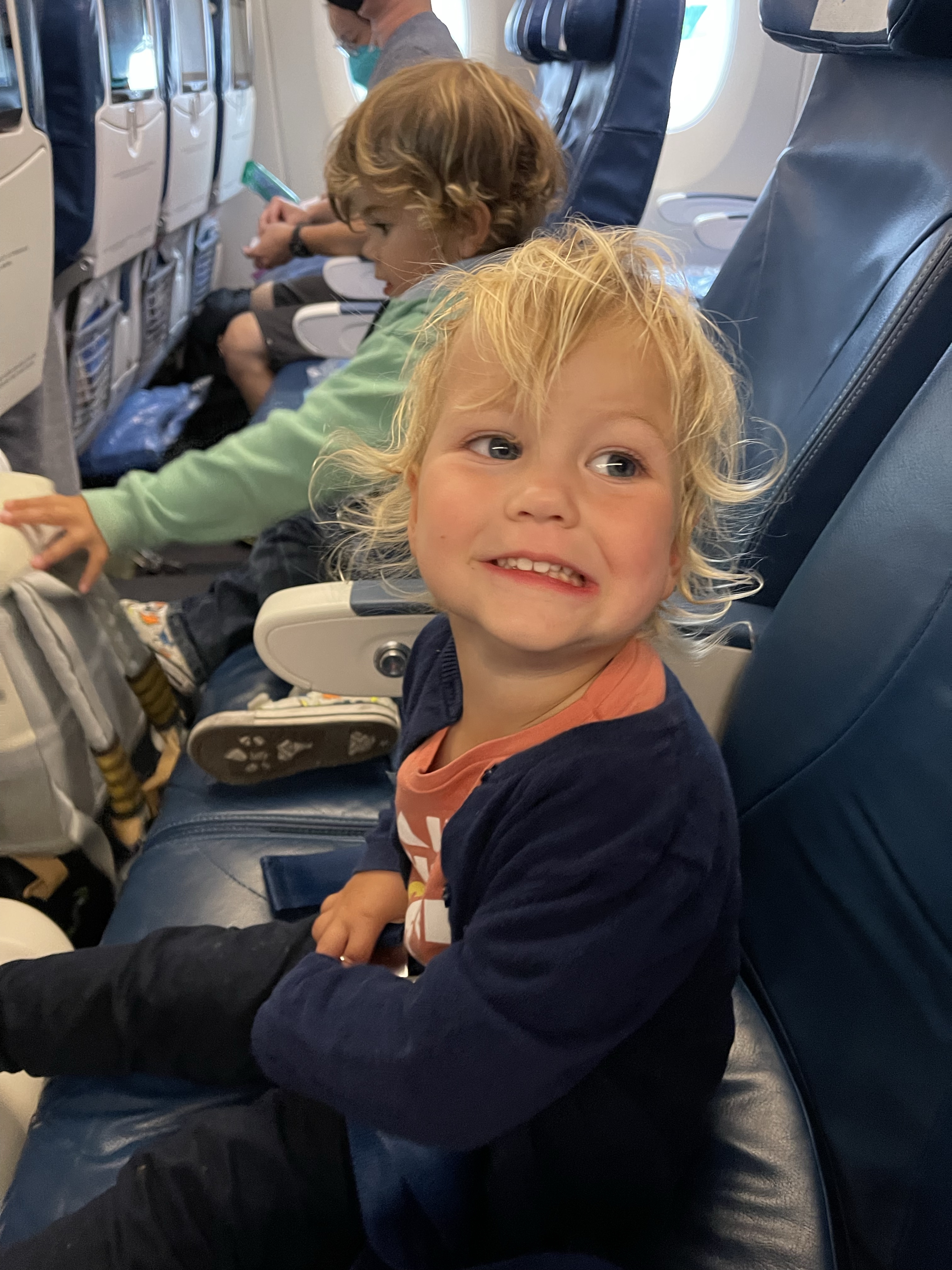 A bord de l’avion nous avons une bonne surprise: il n’y a personne à côté de nous! Nous avons donc un rang de 4 pour nous 3! Les enfants s’installent donc dans leurs sièges!