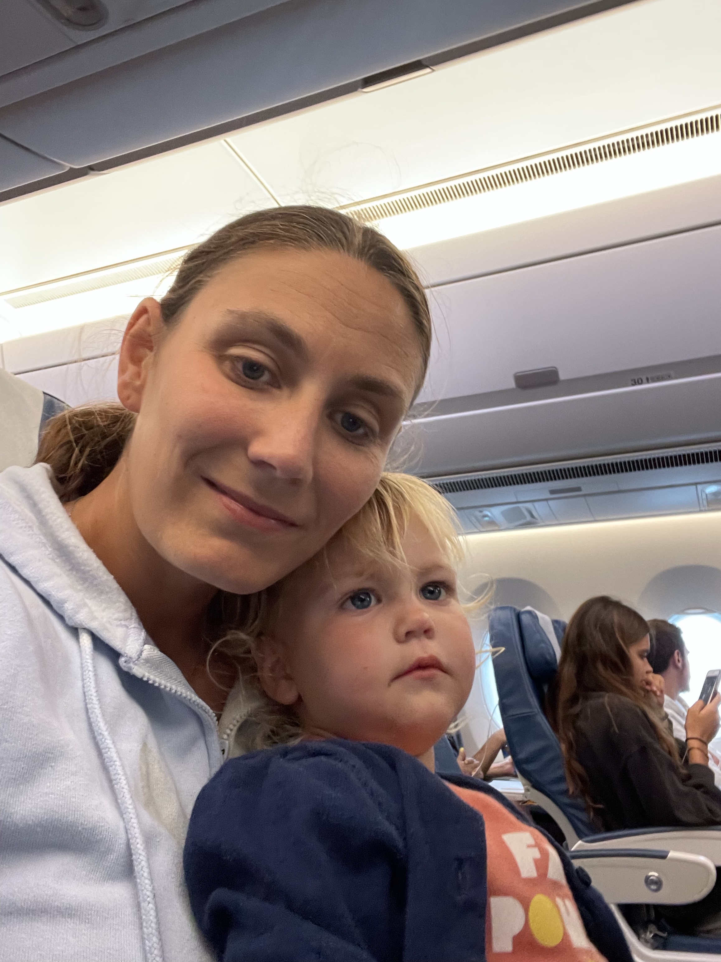 Deuxième quête remplir les gourdes pour le voyage… la seule fontaine à eau s’est avérée plus difficile à trouver avec en plus les enfants qui fatiguaient… mais une fois les deux missions réalisées, nous nous sommes enfin mis en route vers la porte d’embarquement où nous avons attendu longtemps. (Je vous passe les détails des plusieurs chutes d’Eleonore sur la tête et la couche à changer au milieu de l’aéroport…)