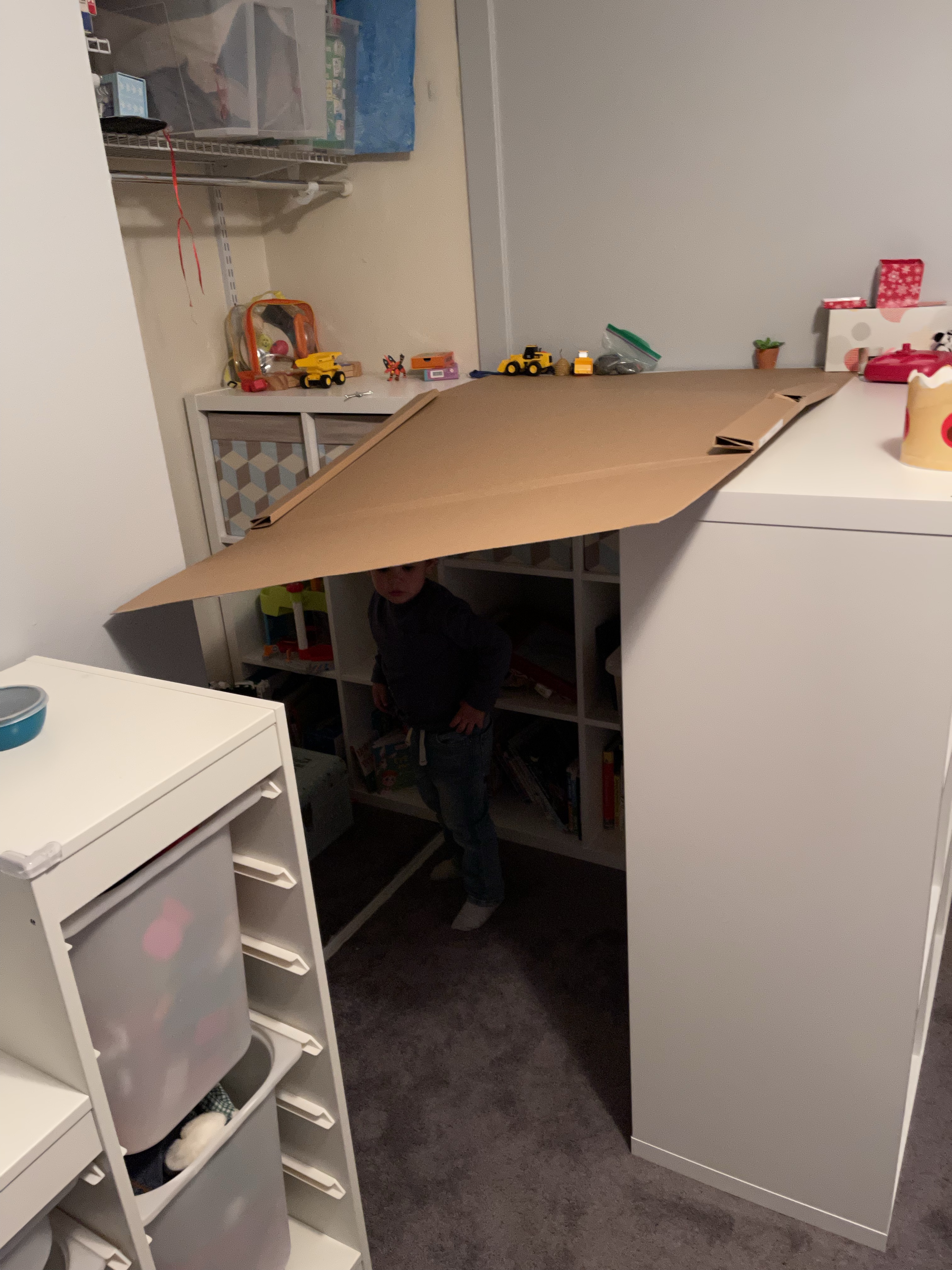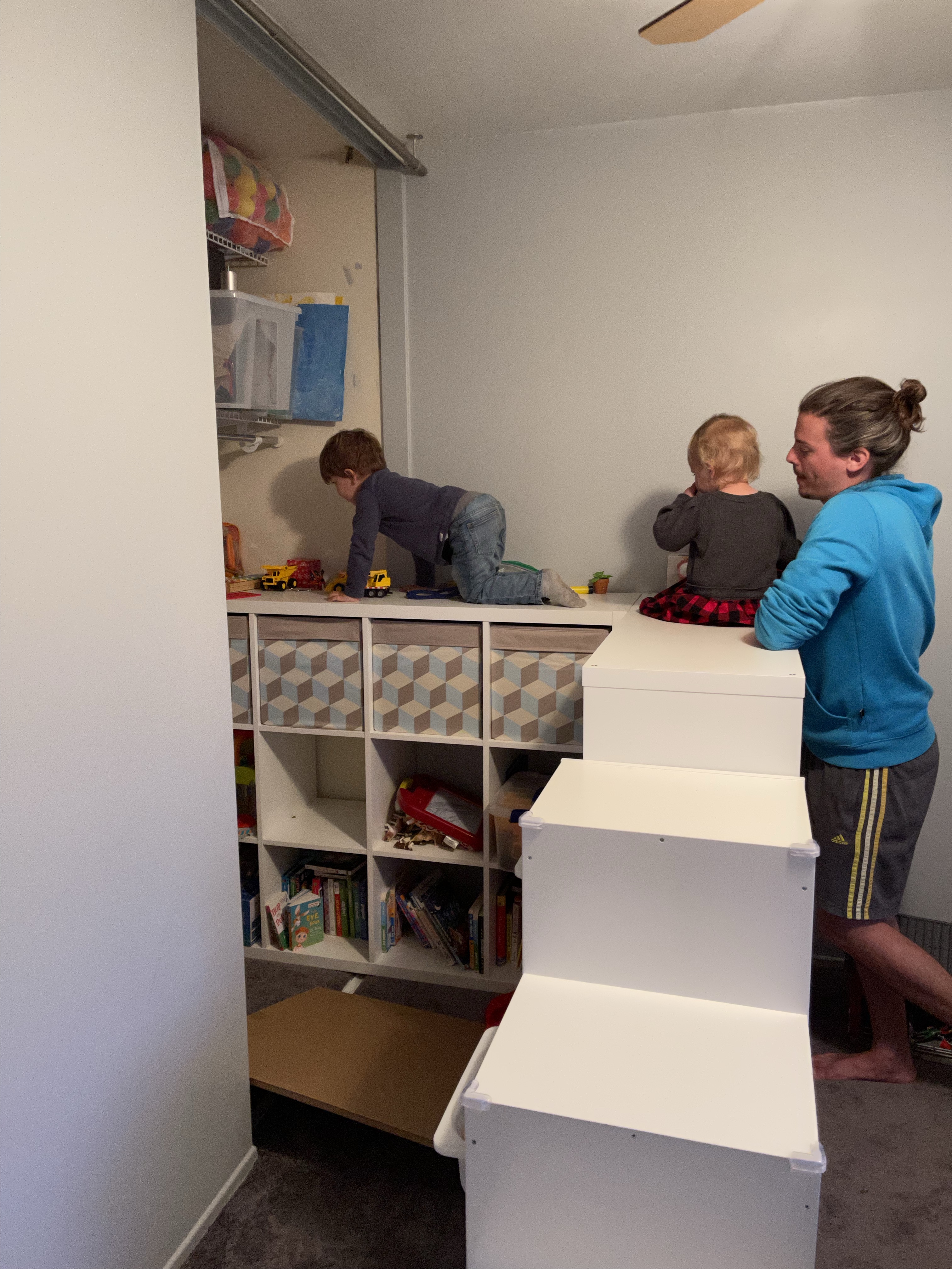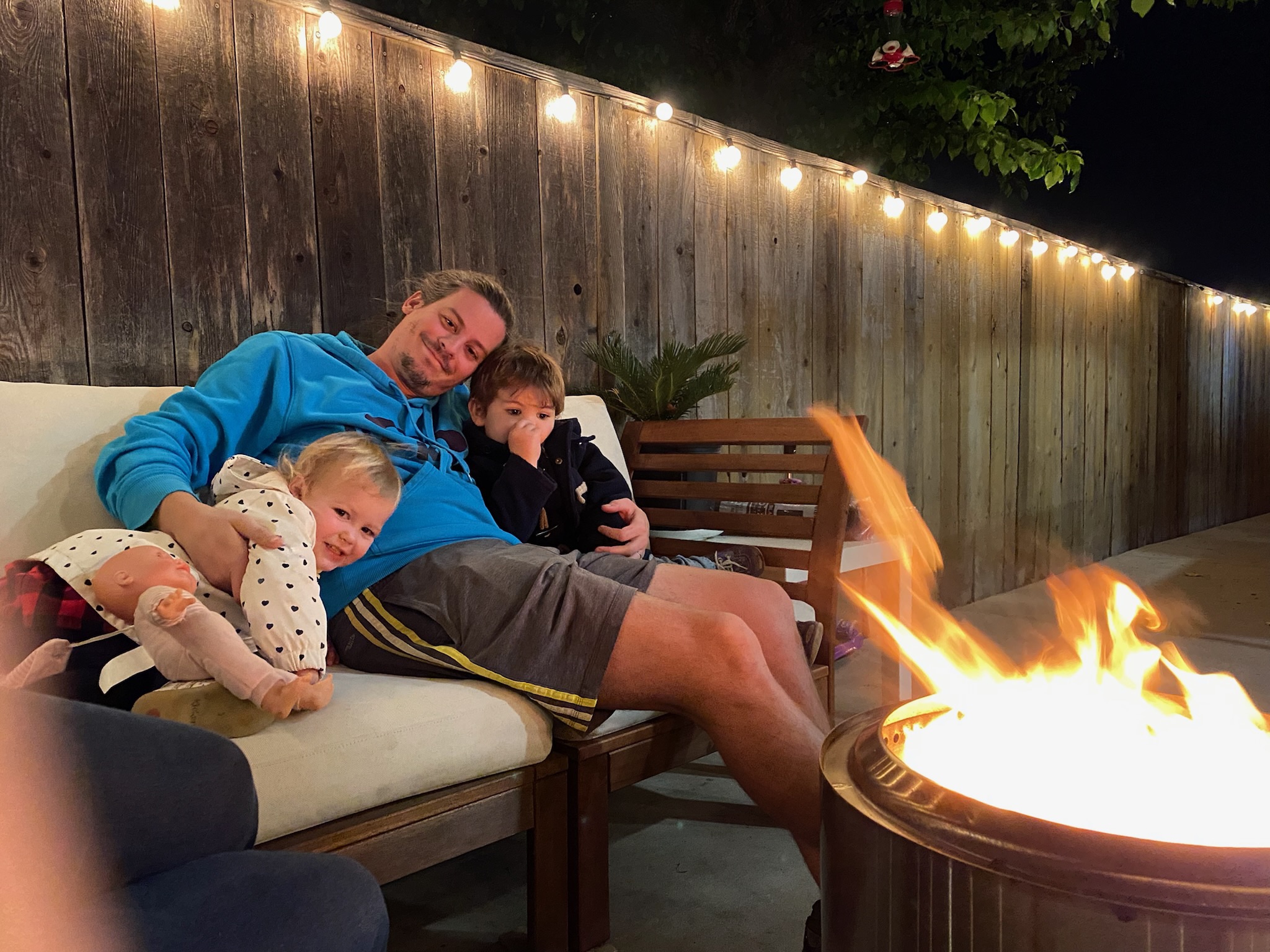 Après la sieste, nous réorganisons la playroom des enfants afin de voir ce que ça donnerait avec la cabane! Les enfants s’en donnent à cœur joie et grimpent partout! Avant de faire un fire pit (un peu en retard!)