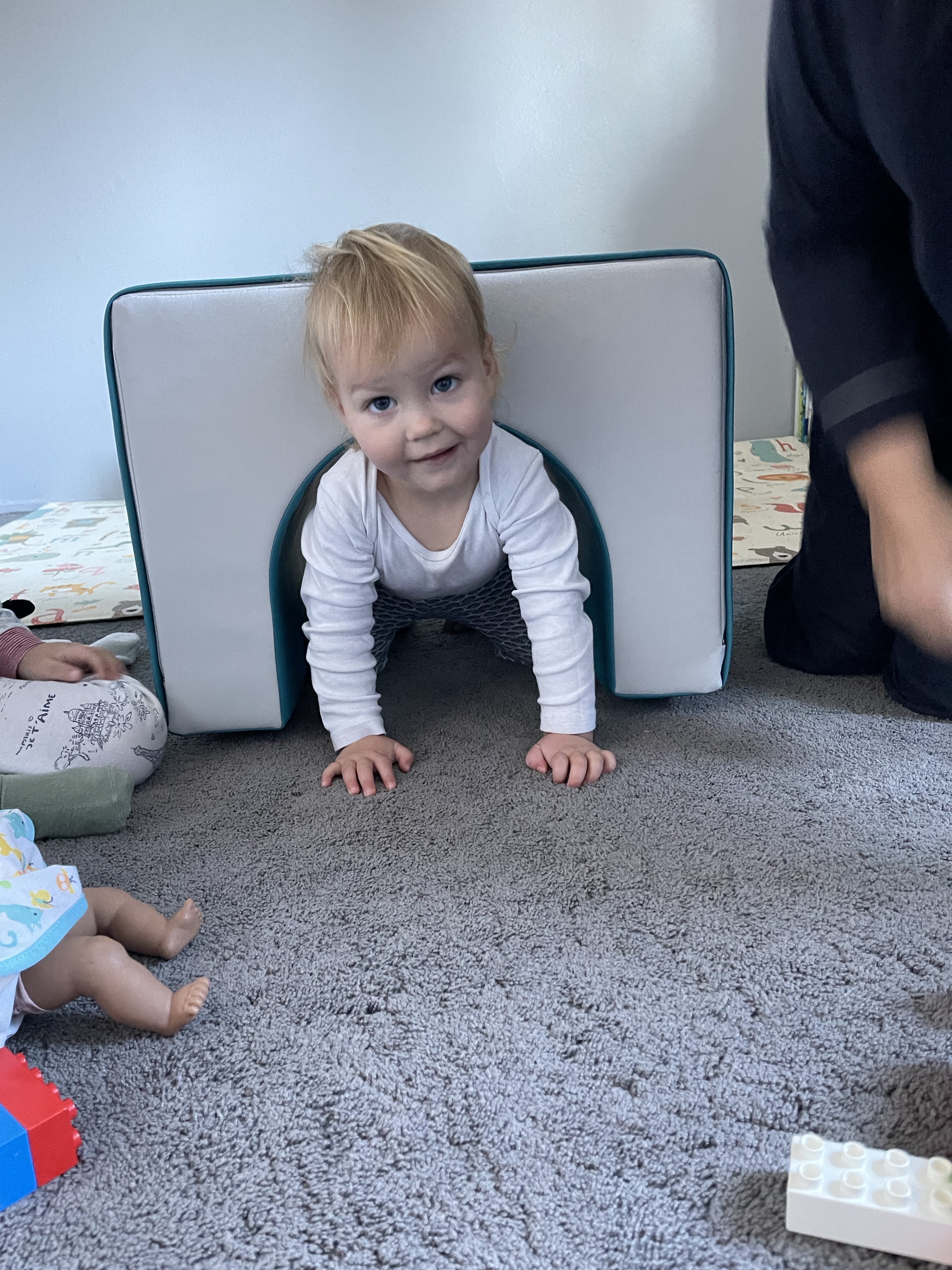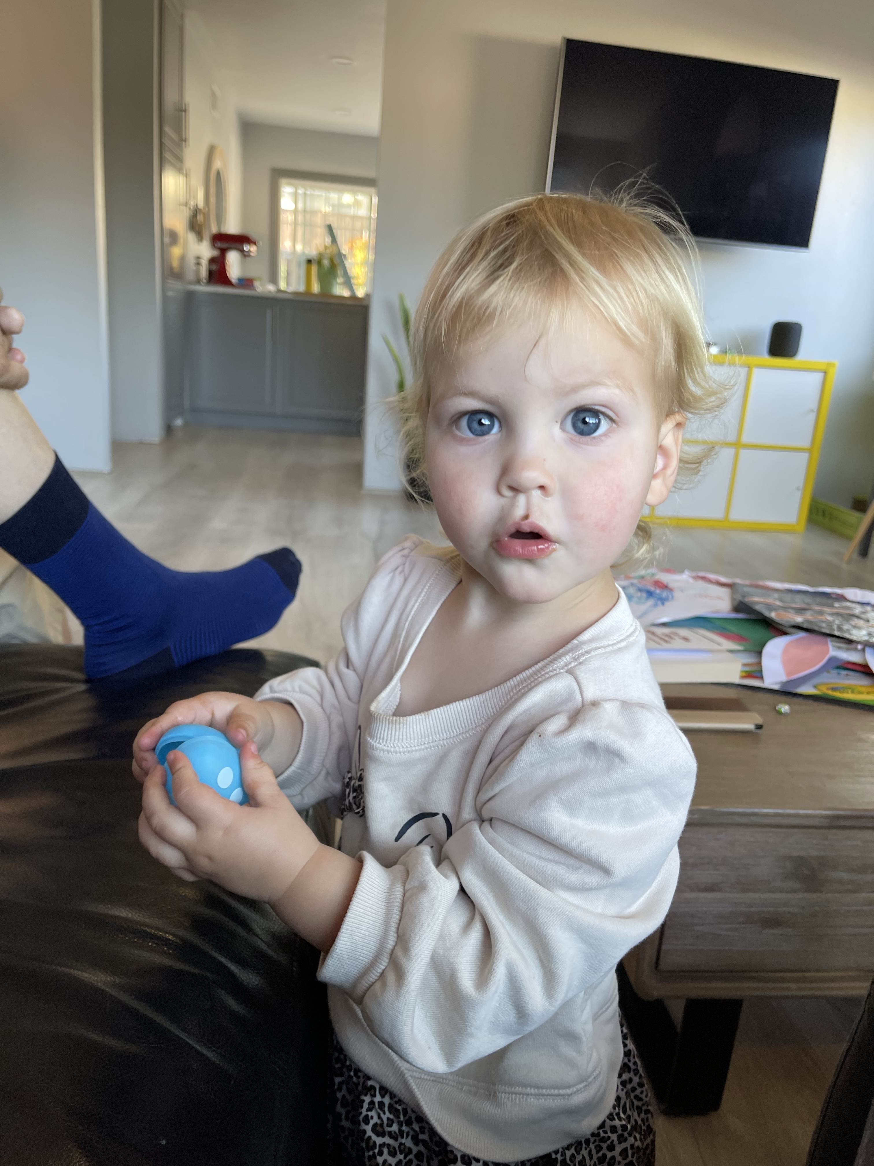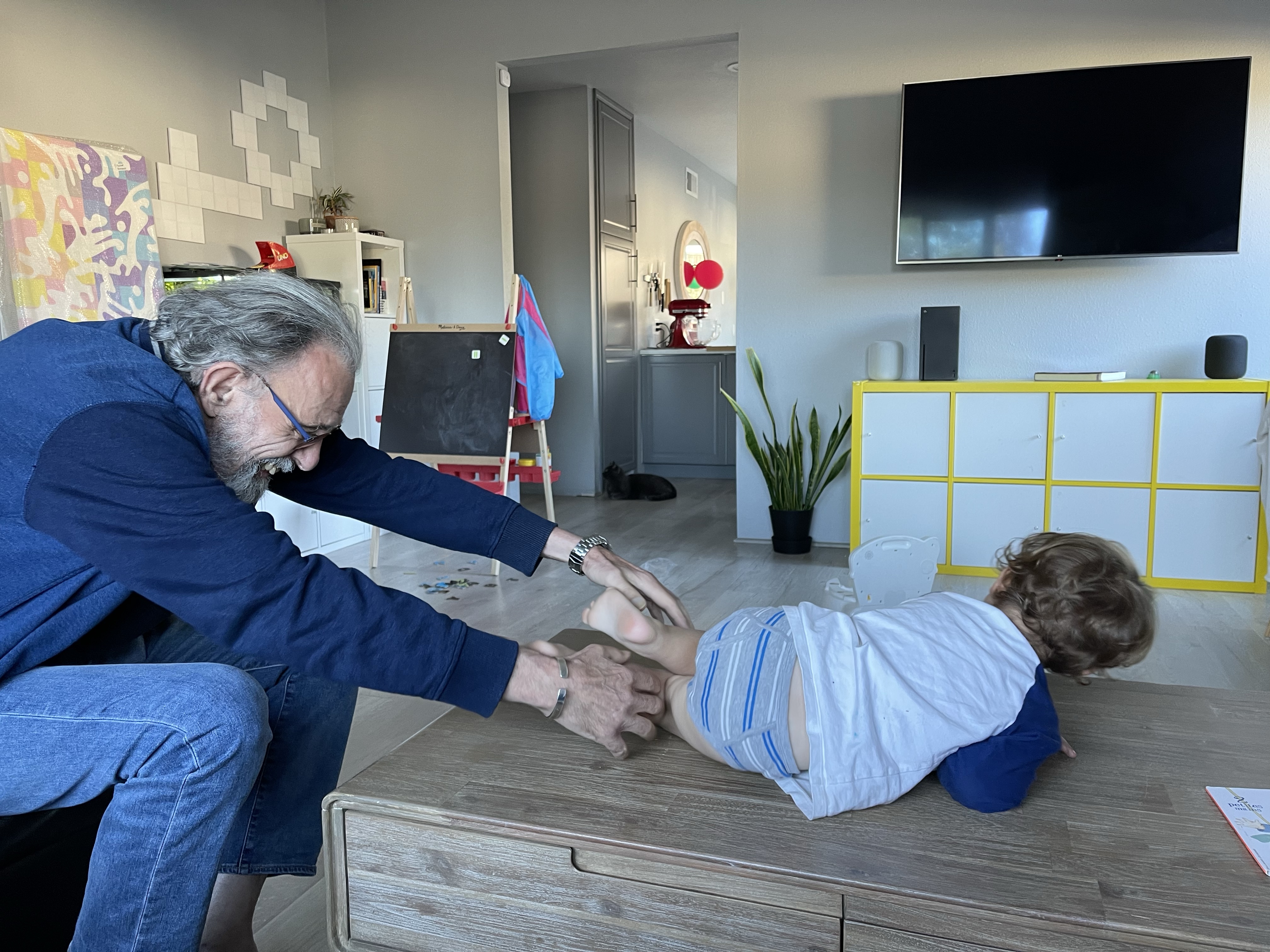 Et quand nous ne nous promenons pas, nous jouons au ballon au dessus de la table basse et aux chatouilles!