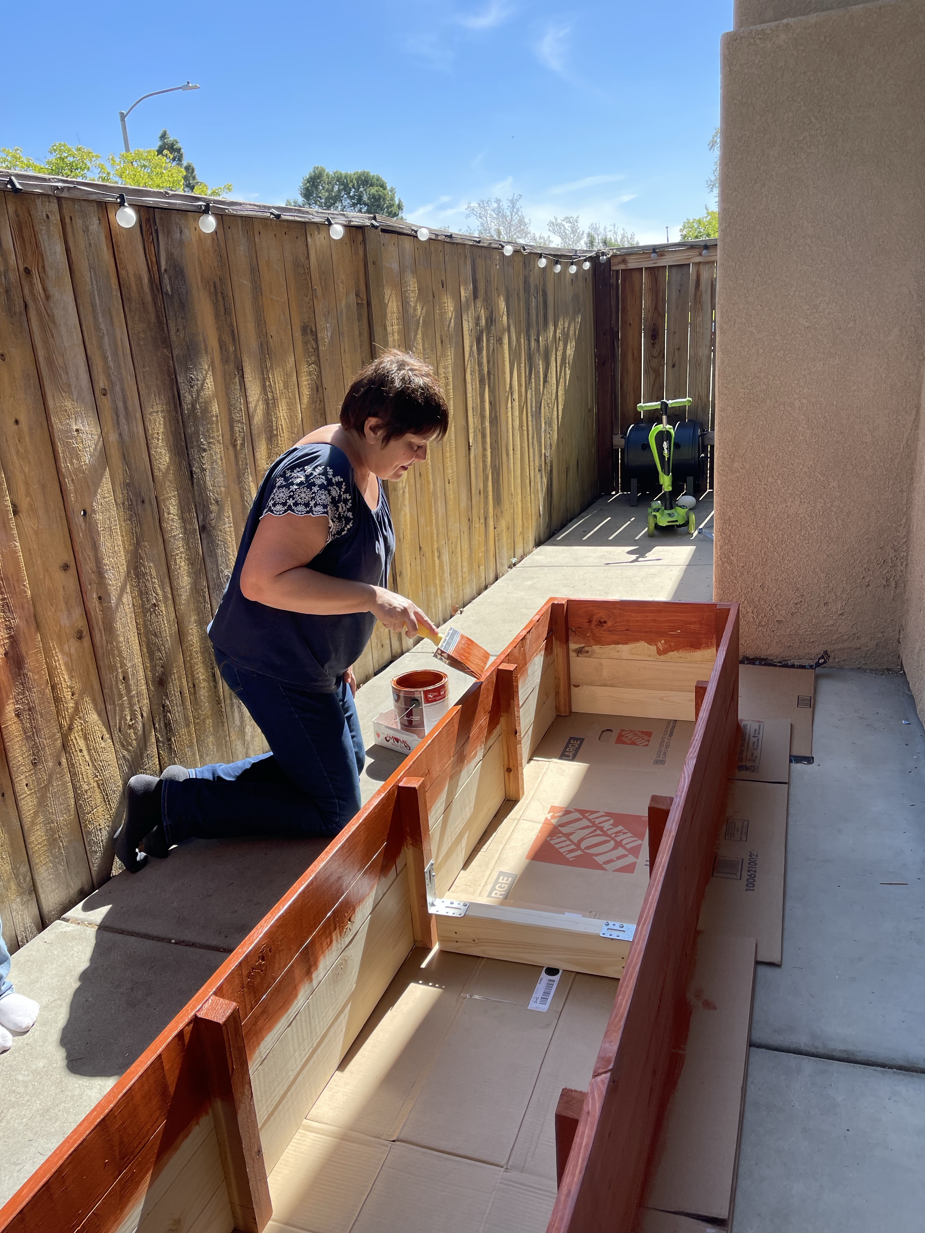Après avoir construit les bacs, il faut les peindre! Voilà notre activité du vendredi toute trouvée! Eleonore et moi faisons dans un premier temps équipe à la maison et jouons au train et autres jeux pendant que mamie peint et papa construit l’autre bac avec son fils.