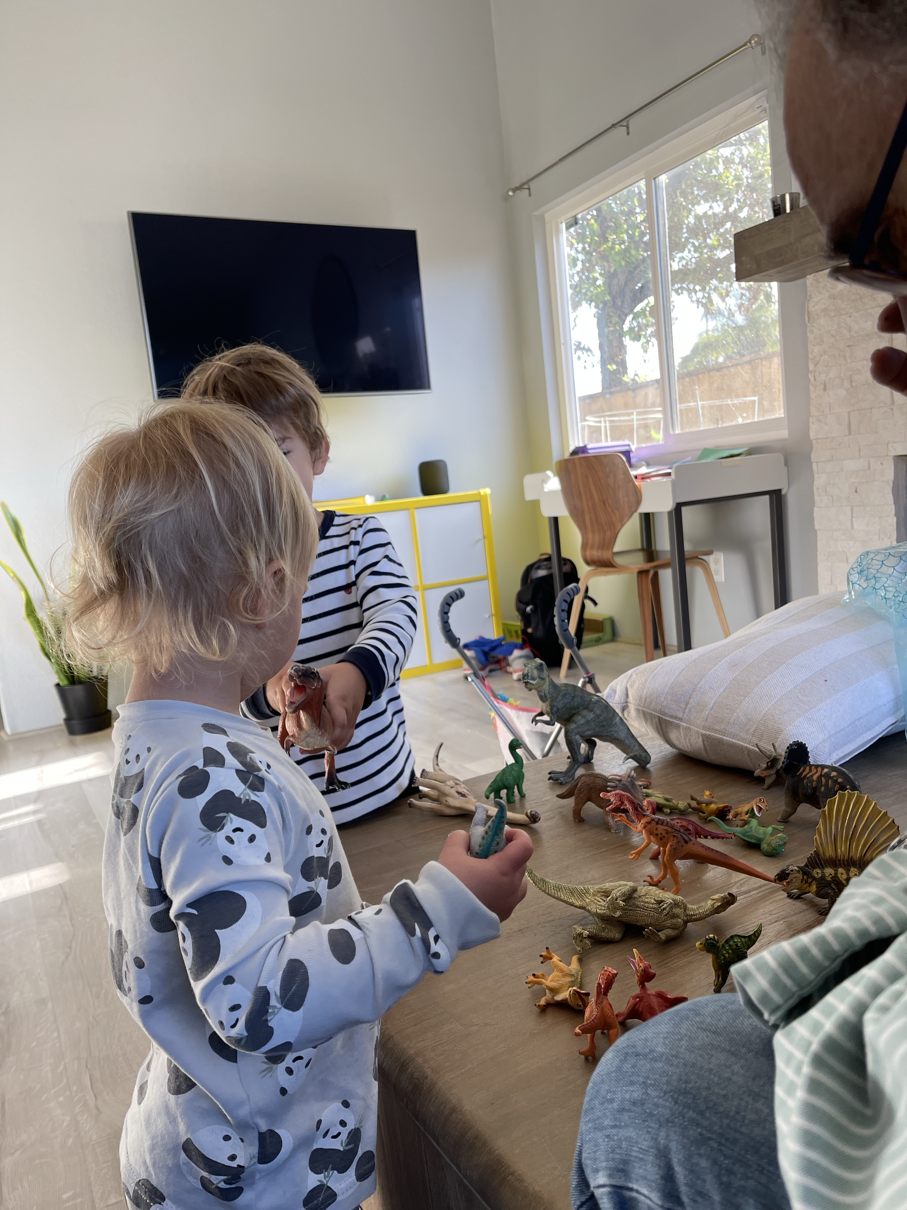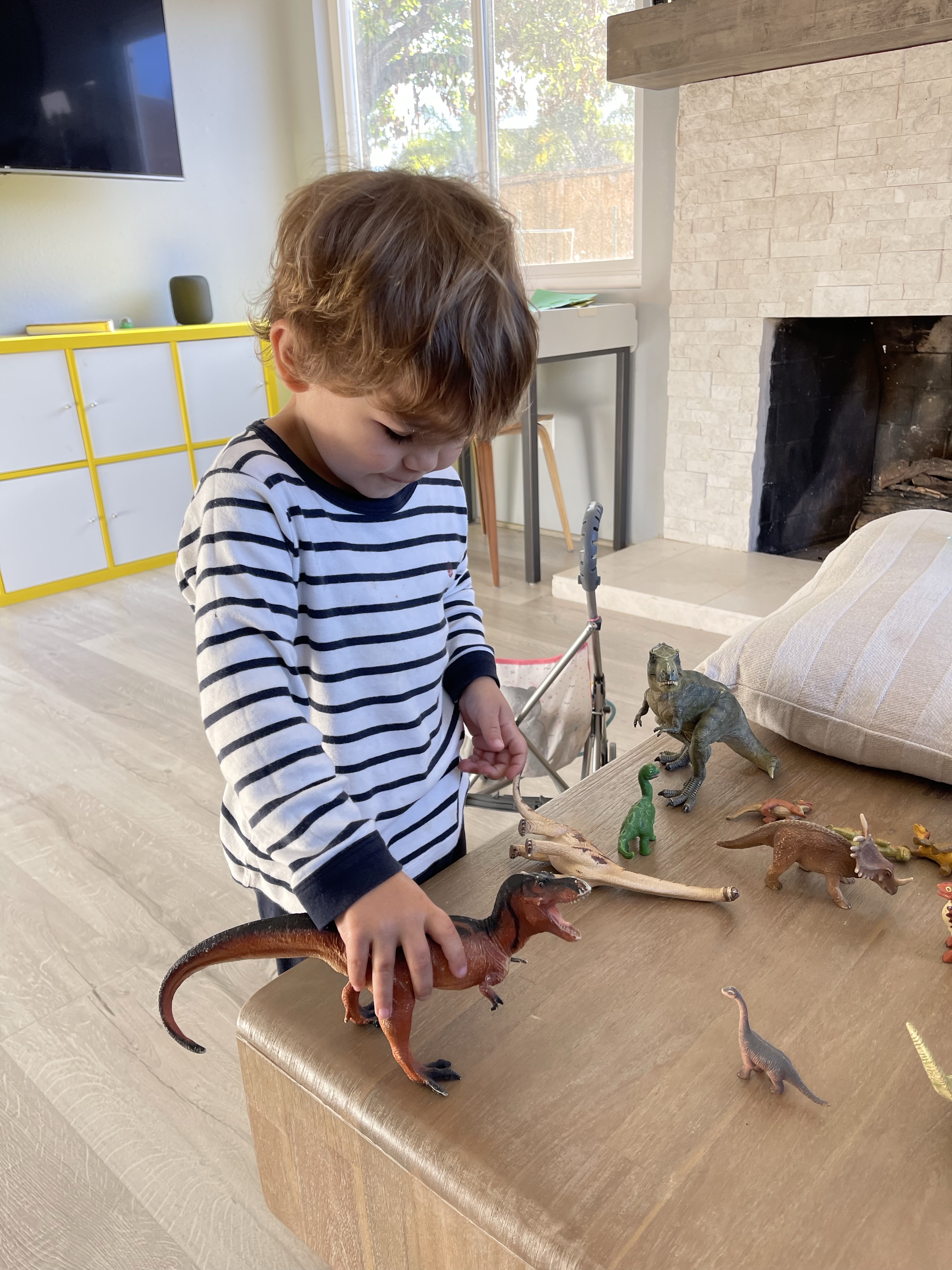 Dès le vendredi matin, c’est la fête! papi donne les dinosaures de tonton Hugo aux enfants qui sont ravis! Surtout qu’il y a un T-Rex dont la gueule s’ouvre et se ferme!