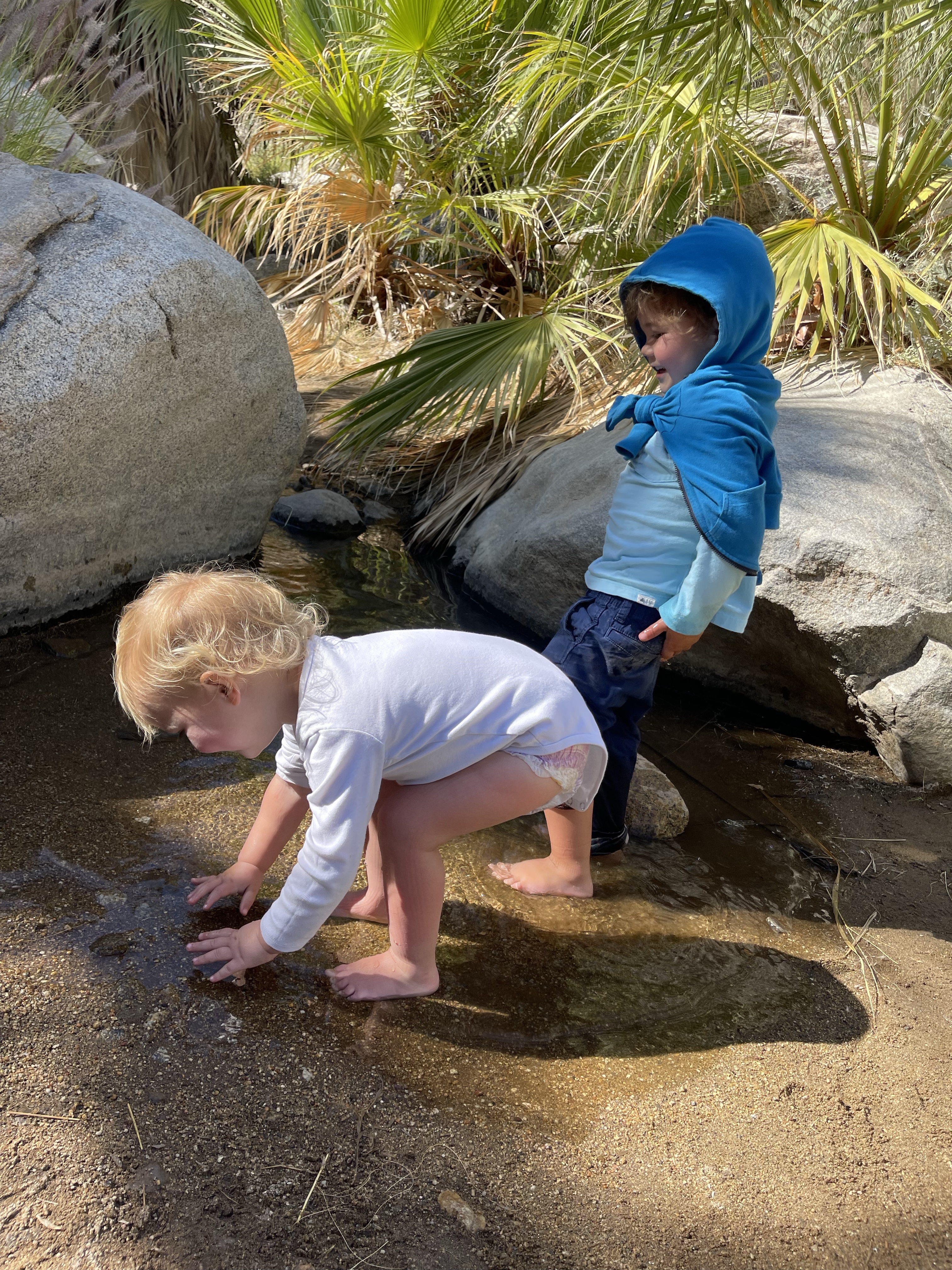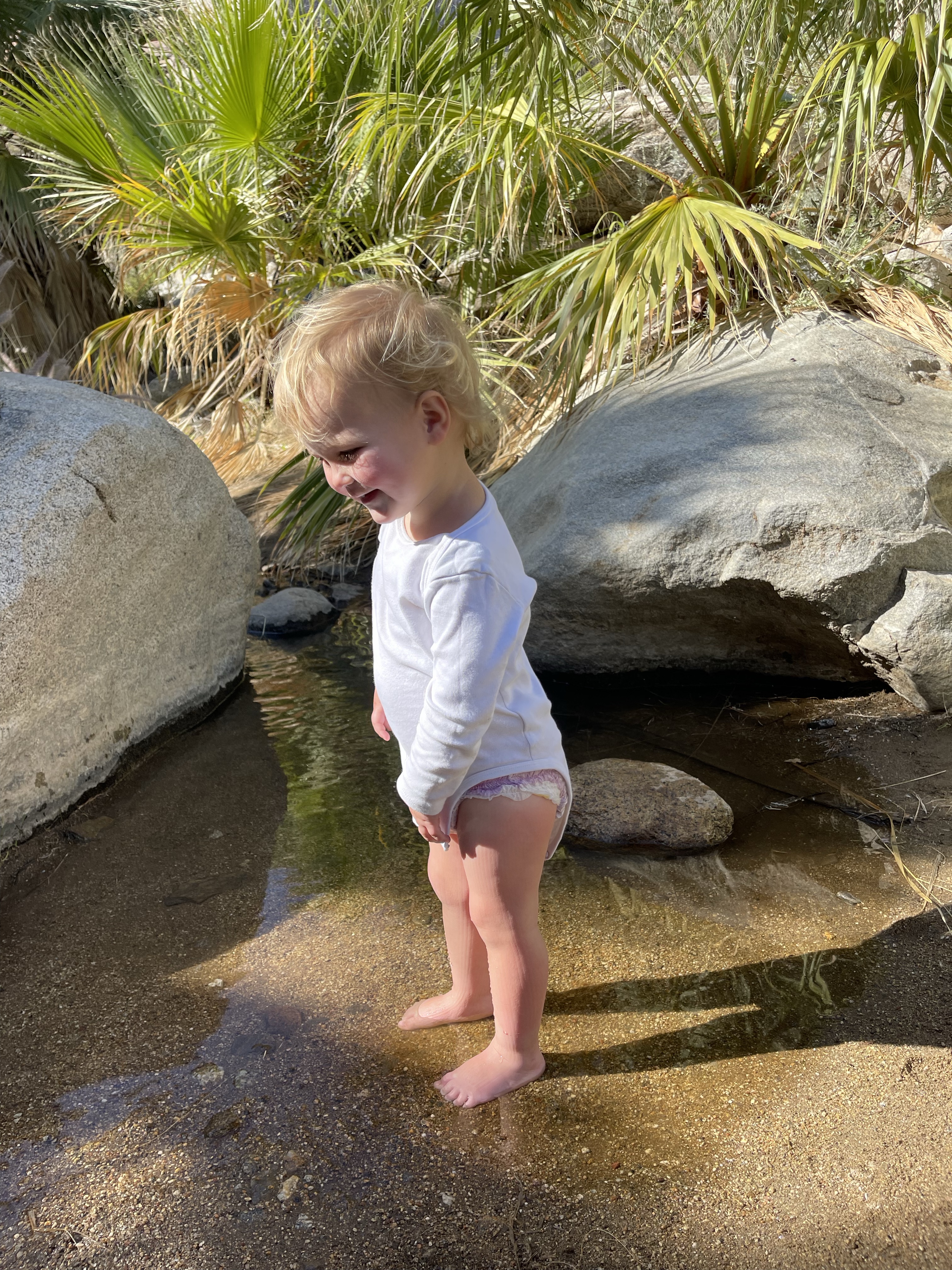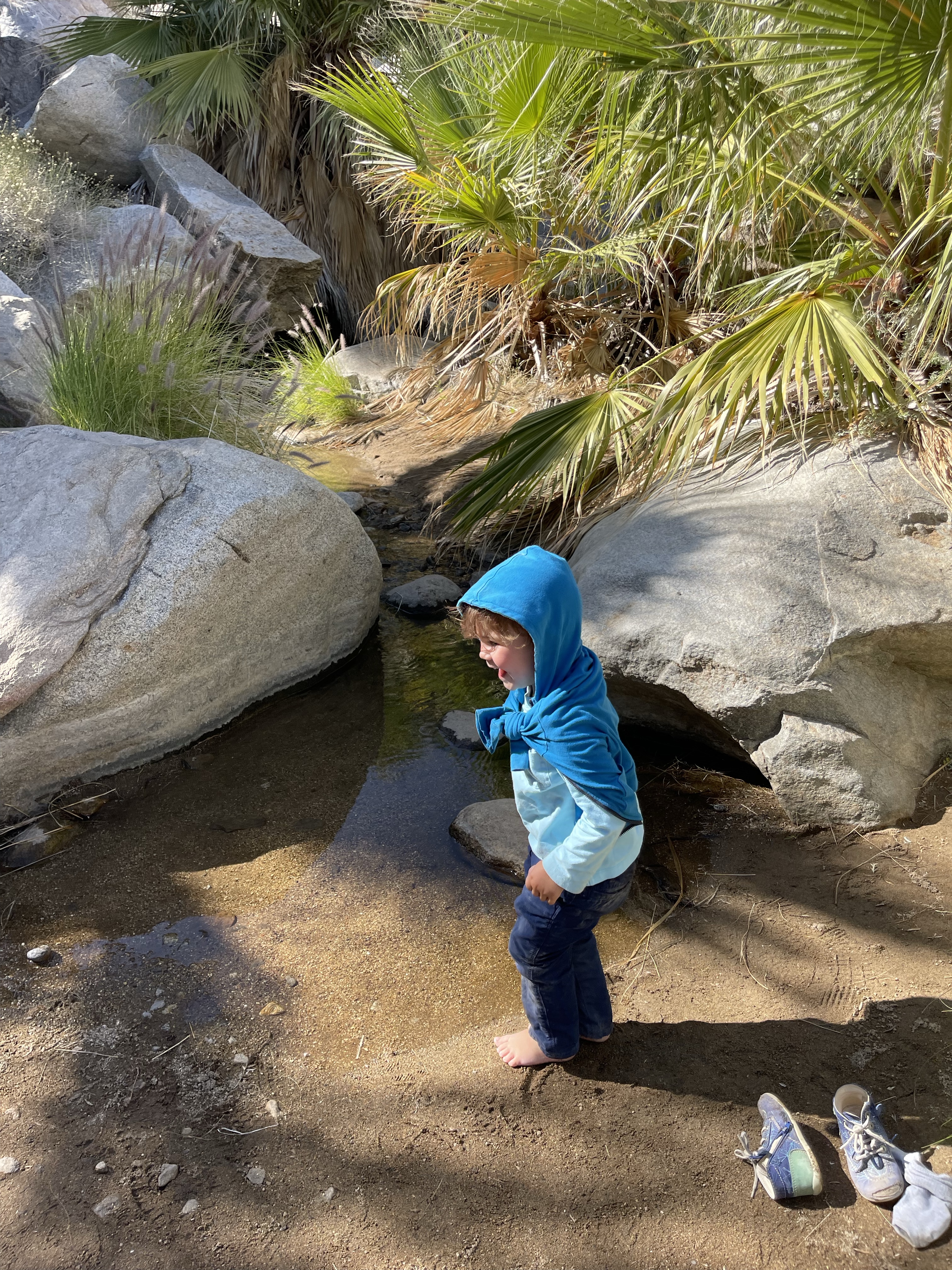 Heureusement à l’arrivée, les enfants ont pu se rafraîchir les pieds dans l’oasis pour leur plus grand bonheur! Nous avions en effet gardé nos vêtements chauds qui nous ont bien protégé des coups de soleil! Nous avons également entendu les coyotes hurler sur le chemin du retour! C’était super!