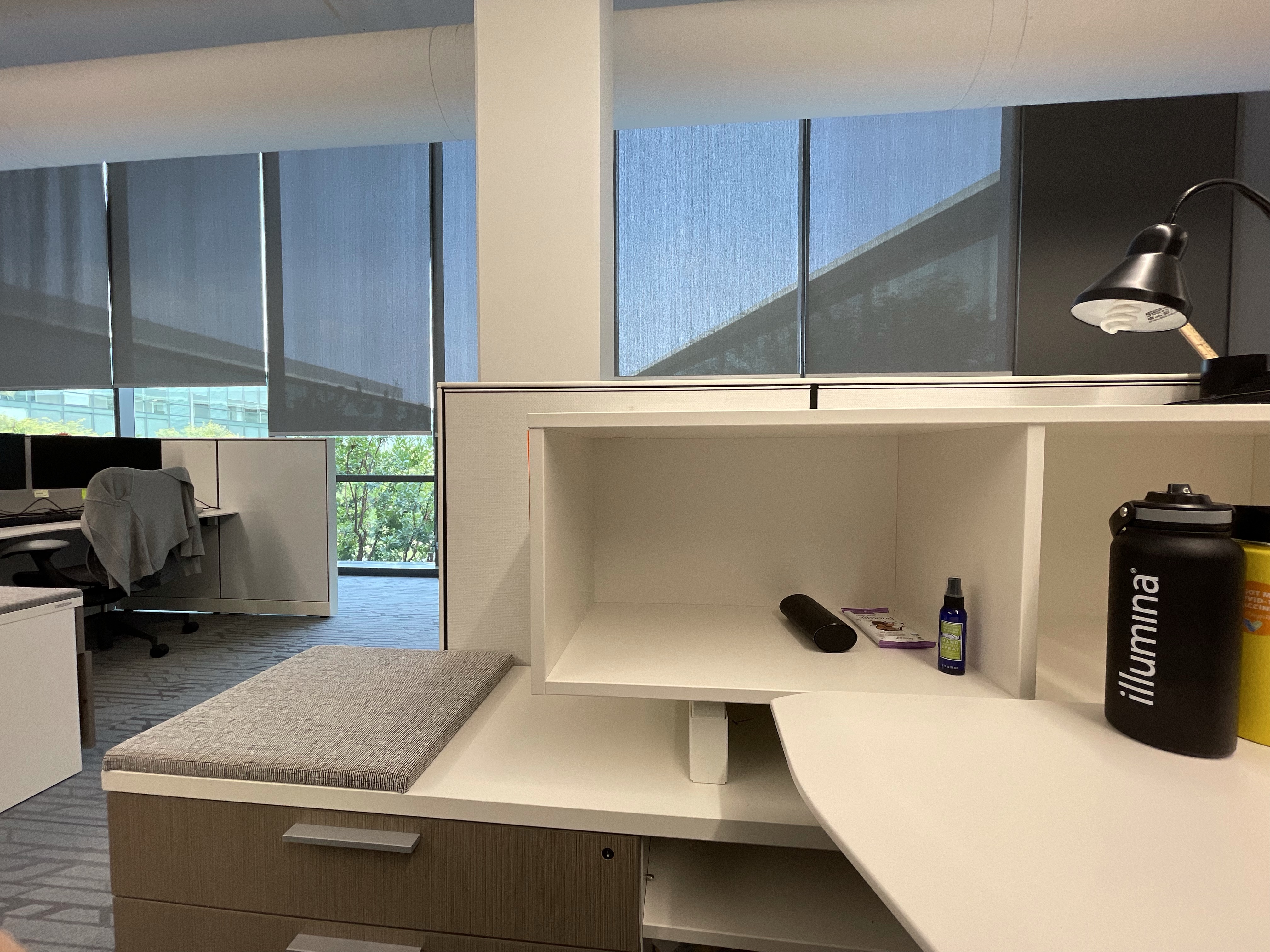 Il a grand bureau près des fenêtres! Il est très content! En plus il y a les cafés à volonté donc bon… en plus d’avoir emmené son grand mug, il en a quand même bu 3 aujourd’hui….