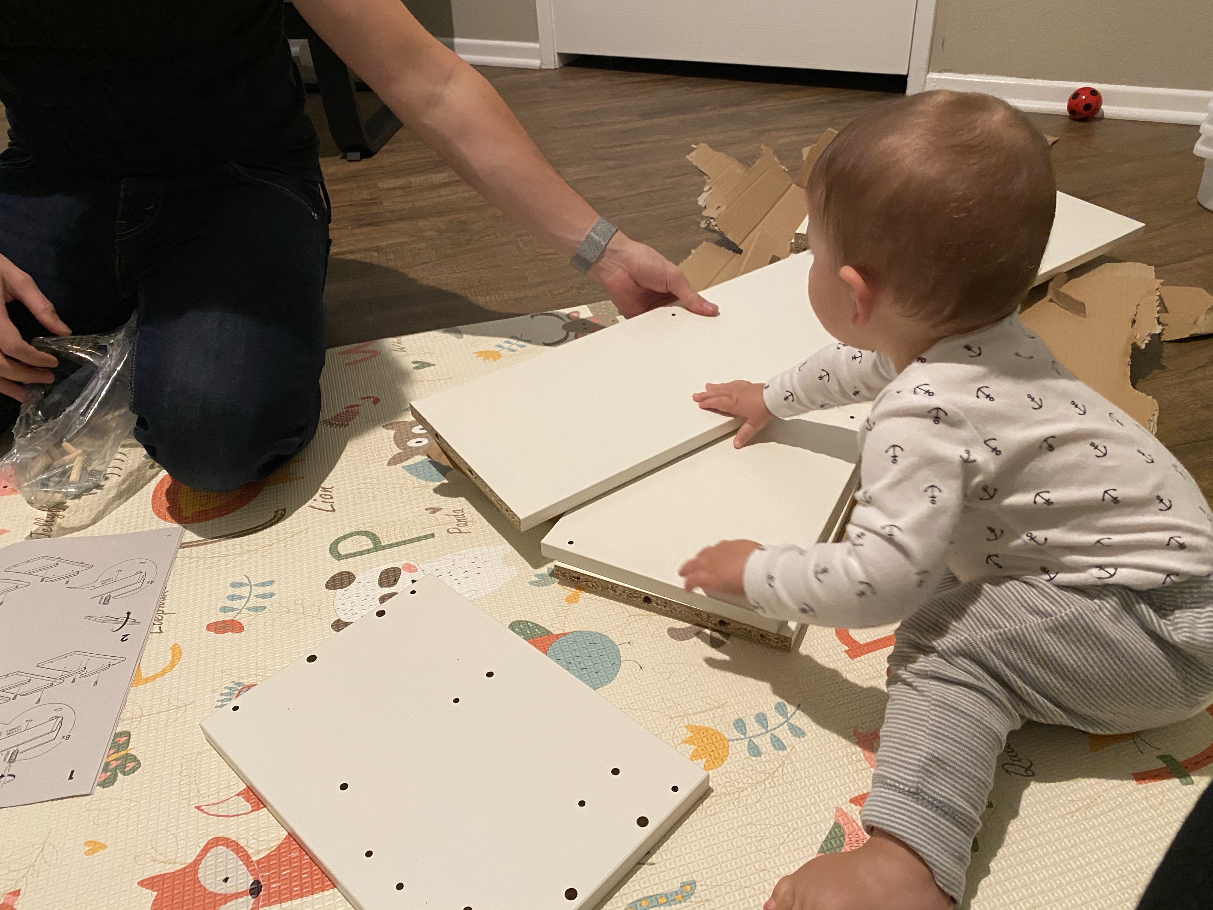 Et après le magasin, Gabriel a voulu aider son papa pour construire le meuble… normal!