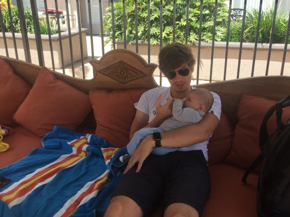 Isa en profite pour donner un biberon!Le dimanche c’est relax et piscine!