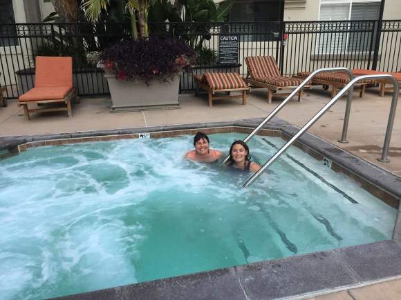 Isa en profite pour mettre les pieds dans l’eau!Entre deux promenades, Gabriel se repose dans sa poussette!Nous commençons une nouvelle tradition : le jacuzzi du soir!Avec Papi Luc! (Luc je t’entends déjà rouspéter sur ta tête ça n’est pas la peine!)