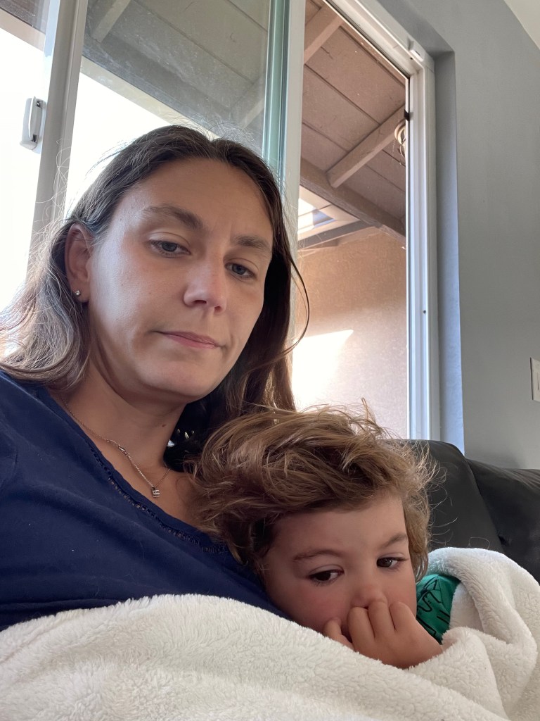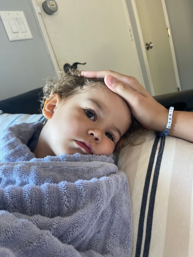 Vers 4:50, le voilà qui arrive dans notre lit avec une fièvre aux alentours de 41… nous prenons donc un nouveau bain tiède et de nouveaux médicaments pour faire baisser la température…