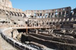 Nous retournons alors sur le lieu de notre première promenade et allons au restaurant choisi! Manque de chance, nous étions trop en avance, le restaurant n’ouvrait ses portes que trente minutes plus tard et il était déjà plein de réservation pour 19h30. La propriétaire m’explique que nous pouvons éventuellement revenir à cette heure là pour tenter notre chance au cas où une réservation ne viendrait pas… Après un moment de concertation avec Guillaume, nous préférons tenter notre chance ailleurs. Nous revenons donc sur nos pas malgré la fatigue qui commence clairement à se faire sentir et le fait d’avoir un peu l’impression de tourner en rond!!! Nous traversons le Circus Maximus qui est libre d’accès et où nous sentons un peu plus l’ambiance des jeux que lorsque nous l’avions observé depuis le palatin (alors que si on nous avait pas dit que c’était un ancien lieu de jeu du cirque, ça n’aurait en fait été rien d’autre qu’une marche au travers d’une étendue d’herbe!). Nous remontons le long du Colisée afin de nous rendre au restaurant où nous avions mangé le jour de notre visite du Colisée justement (point pratique: il se trouve juste à côté des photos que nous voulons prendre et il était bon!). Une fois arrivé sur place, un petit tour aux toilettes s’impose! Ça fait déjà longtemps que nous sommes partis de l’hôtel et nous avons besoin de nous soulager et de nous rafraîchir. Nous mangeons tranquillement notre repas, gnocchi pour Guillaume avec un petit verre de chianti et salade César pour moi. Juste le temps de prendre encore un petit espresso pour monsieur et nous partons à la chasse aux photos de nuit!