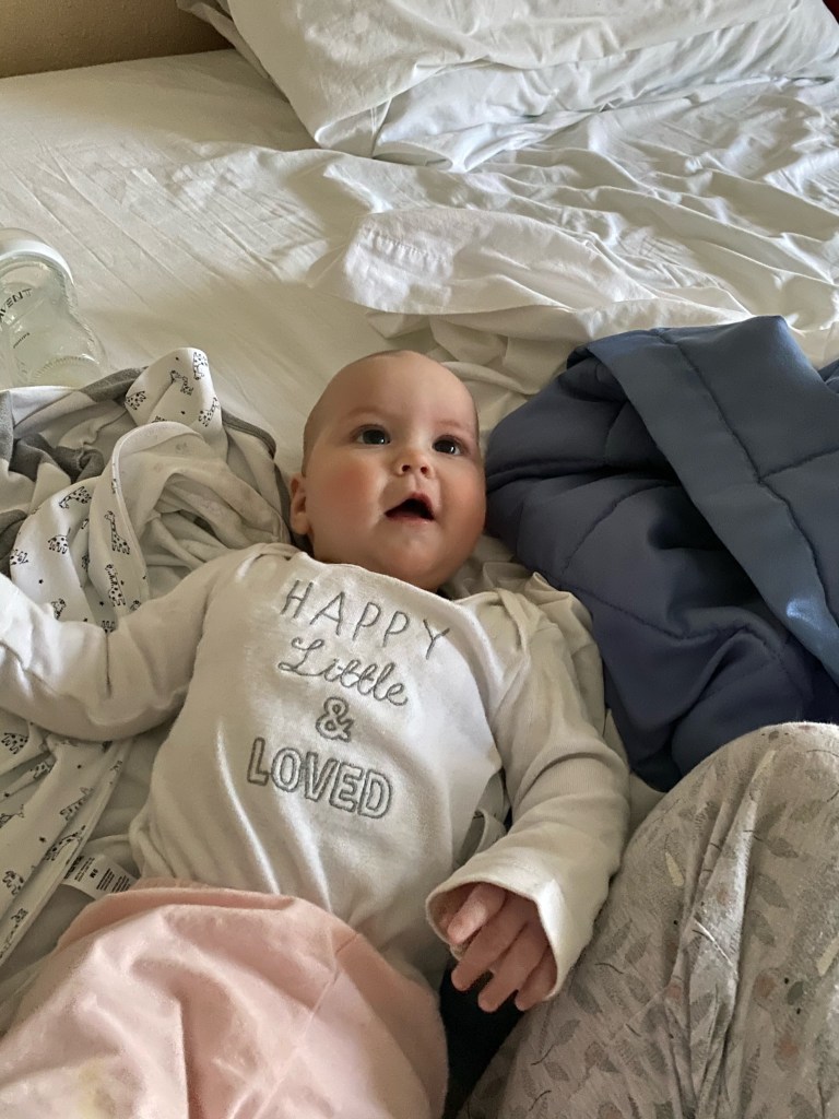 Je prends donc mon mal en patience et attend qu’il se réveille car il dort sur mon ventre. Vers 4h45 je n’en peux plus, je le réveille doucement afin de pouvoir bouger ou au moins me tourner dans le lit.
