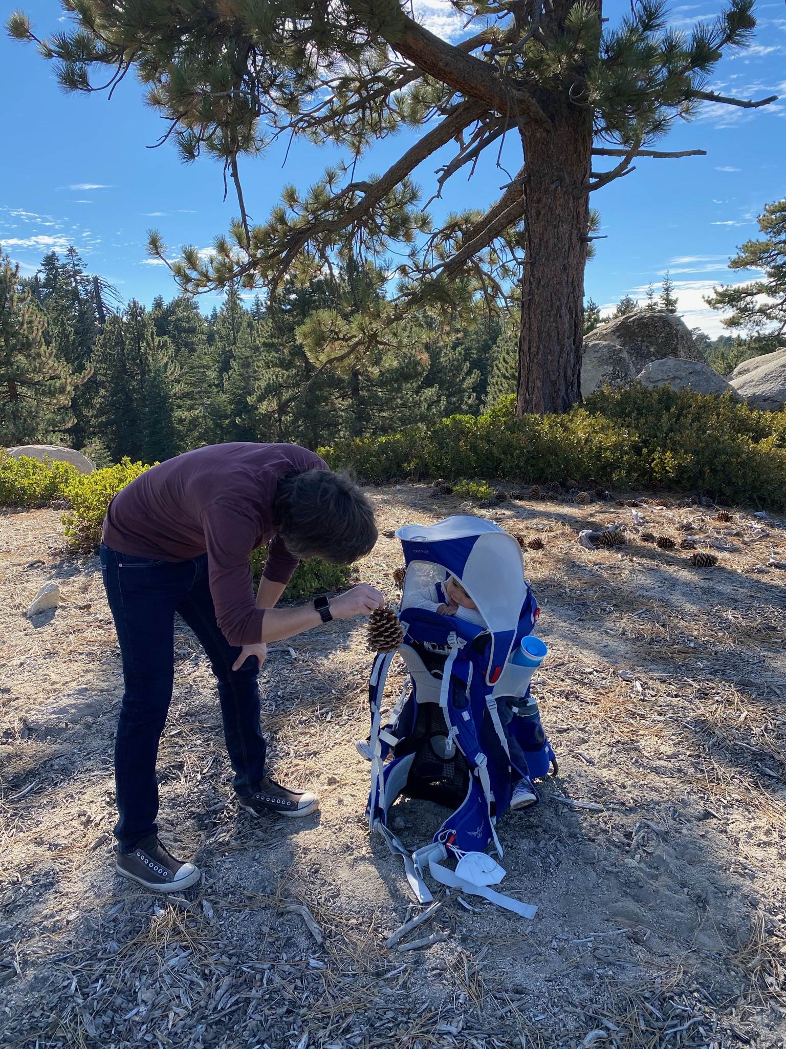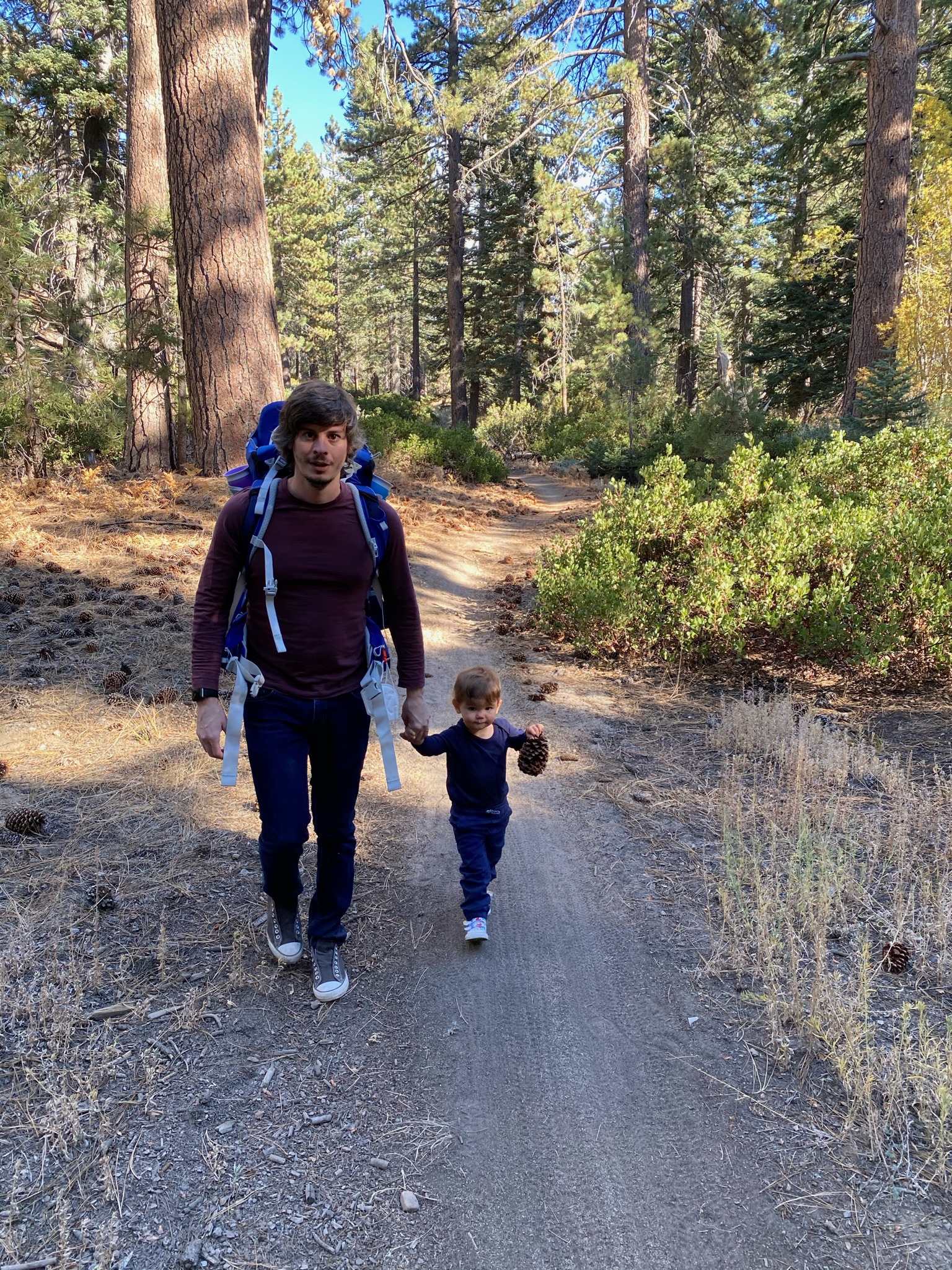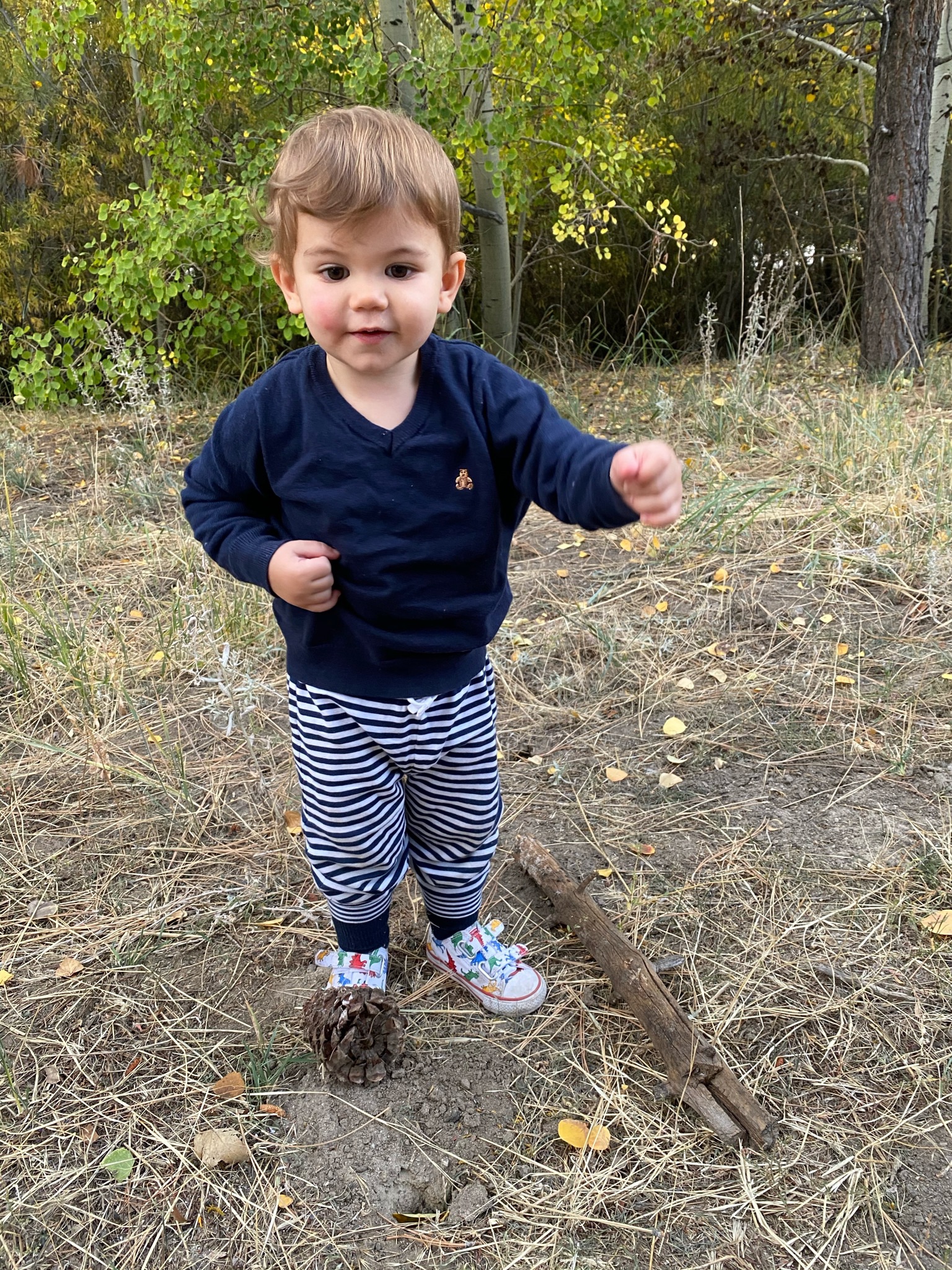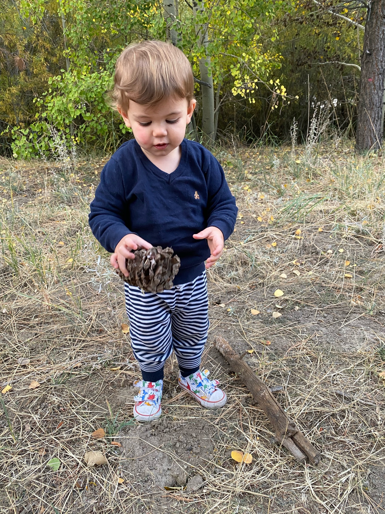 Une super promenade pendant laquelle Gabriel a même marché, motivé par le fait de trouver des pommes de pin sur la route!